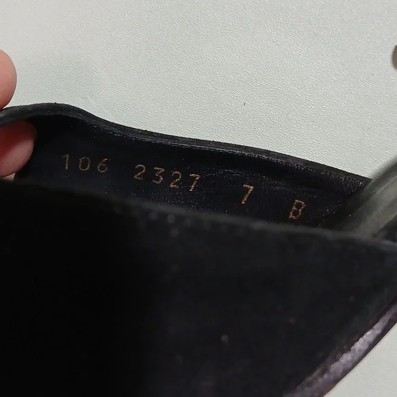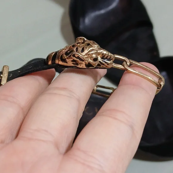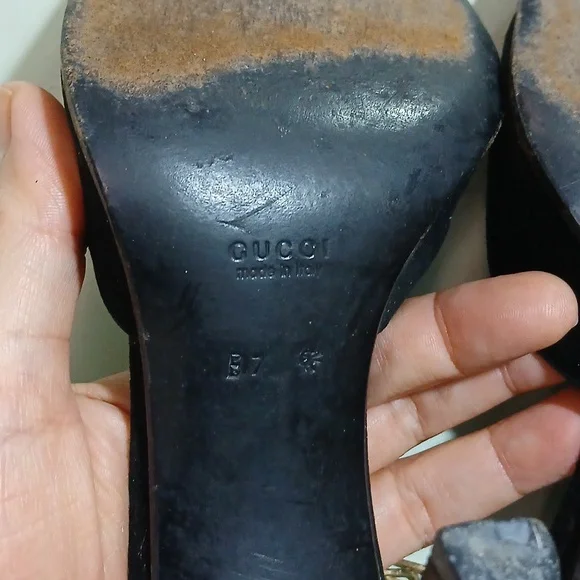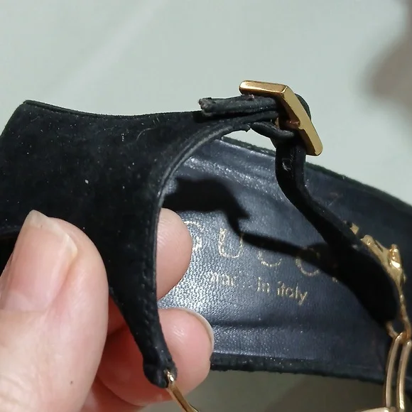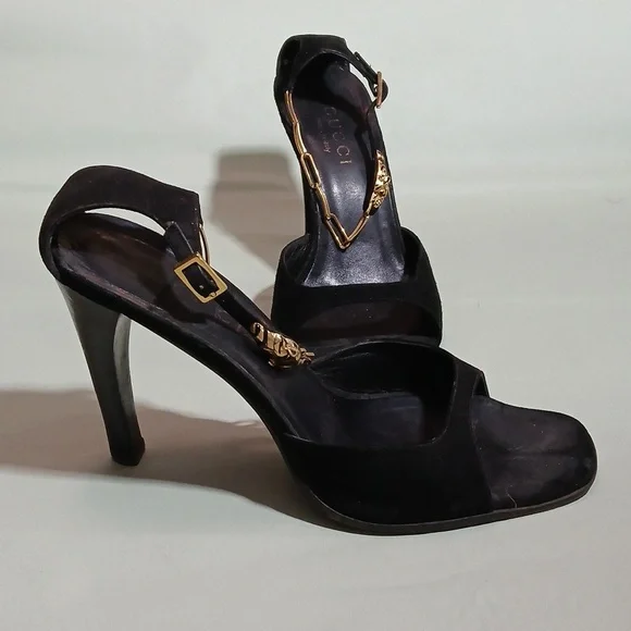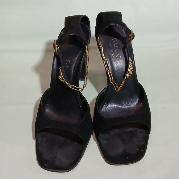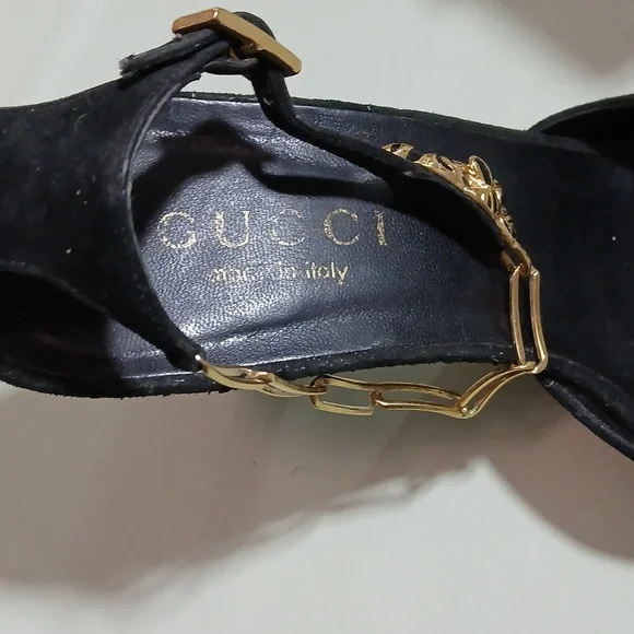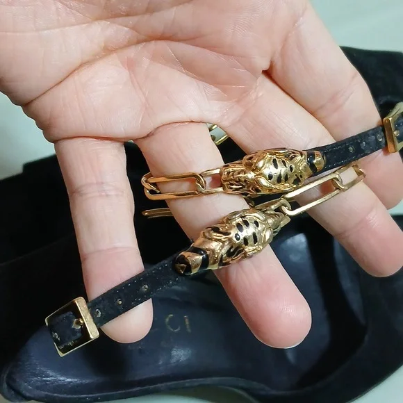 These vintage heels are an absolute grail piece—incredibly rare and fiercely stylish. Crafted in rich black suede, they feature striking chain-link ankle straps adorned with enameled gold leopard head details. It´s a bold, opulent design you won’t find in modern collections, making these a true collector´s item.Marked size 7B, but they run large—best for a US 7.5 (insole measures approx. 9.75"). The 3.75" heel adds the perfect height for a powerful yet wearable statement. These are in good vintage condition with visible wear to the suede and scuffing on the soles (see video and photos). The ankle straps are fully functional, and the overall structure is sound.#GucciVintage #GucciHeels #DesignerShoes #LeopardChainHeels #LuxuryVintage #RareGucci #BlackSuedeHeels #StatementShoes #GucciCollectors #VintageLuxury #IconicStyle #RunwayReady #Size7Shoes #PoshFinds #HighFashion