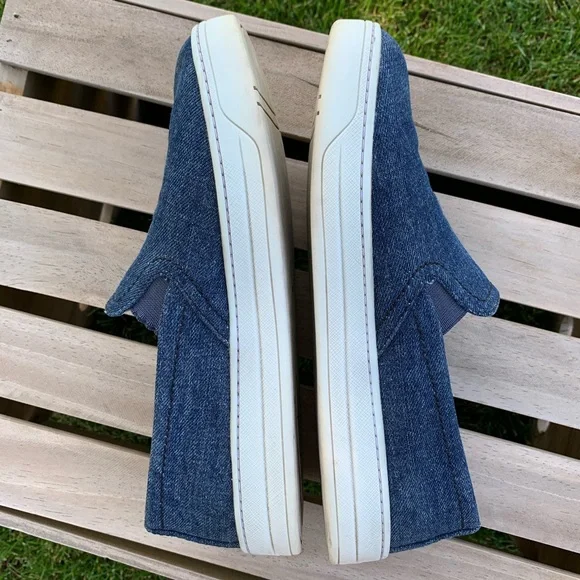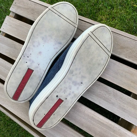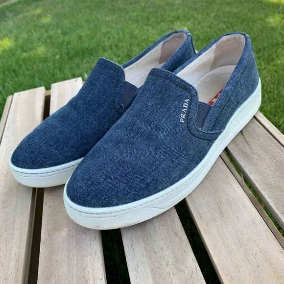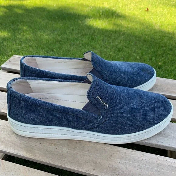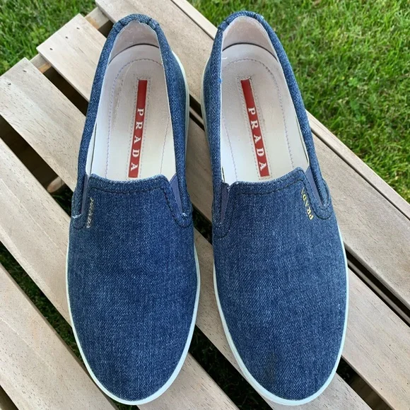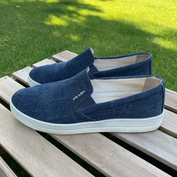 Excellent pre-owned condition PRADA Denim Slip-On Sneakers. Blue denim with whiteplatform and soles. Prada in silver side front ofeach shoe. Leather insoles. Made in Italy.Perfect for travel, business casual or a play date.Please see all photos as they are consideredpart of the description.Reposhing this item I purchased from @savorthevintage. Loved it, but ready to rotate for something new.Questions? Leave a comment below!