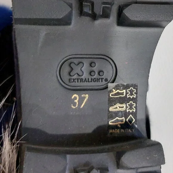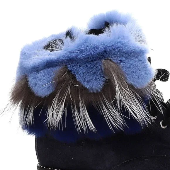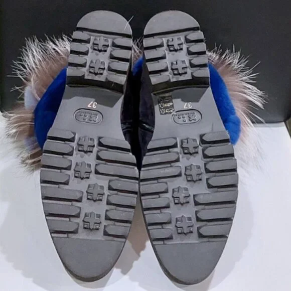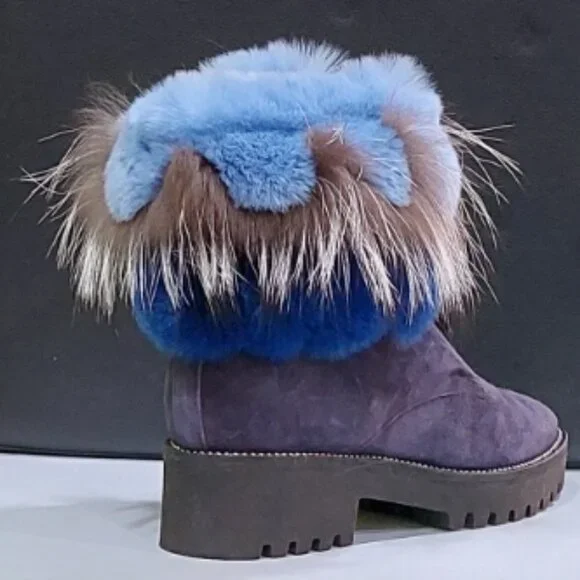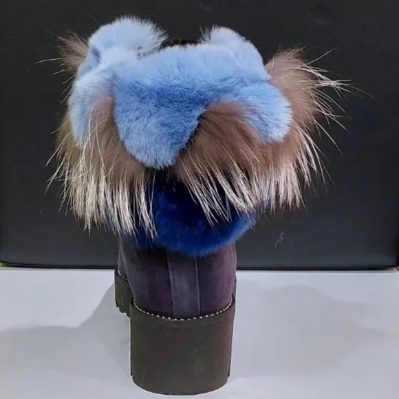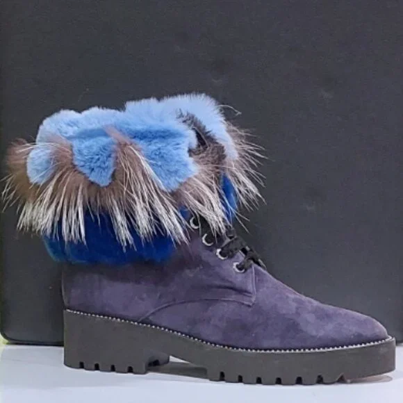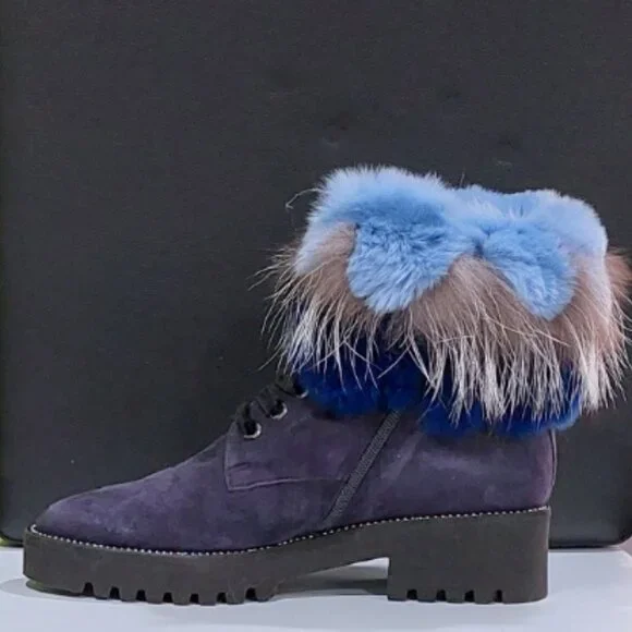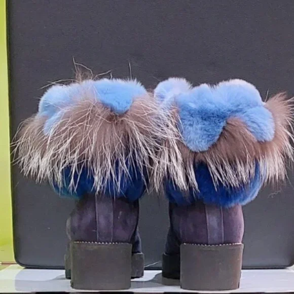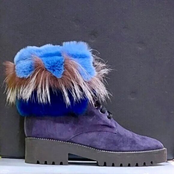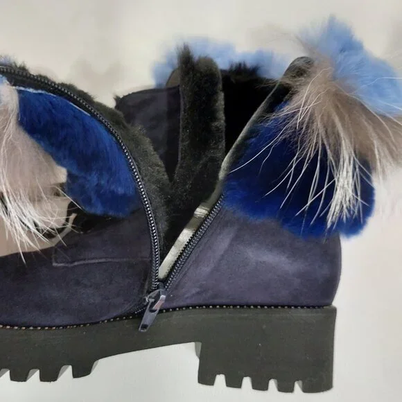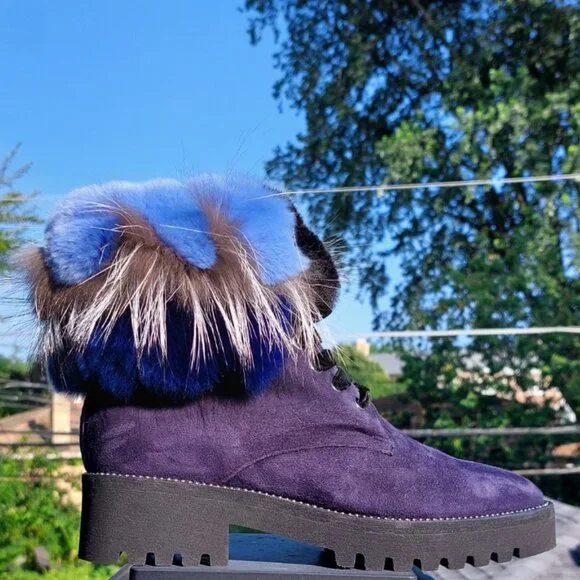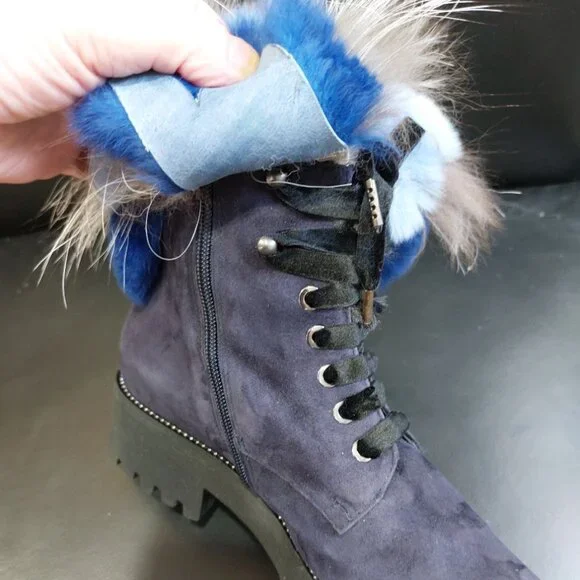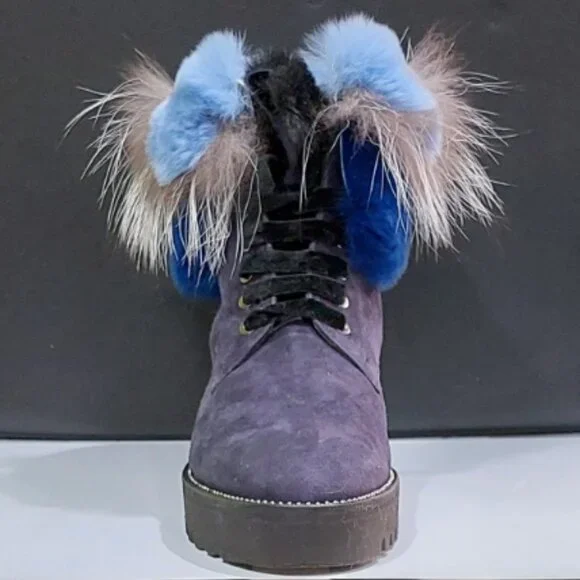 RARE FIND! An absolutely stunning, EXTRA LIGHT ultra-chic handmade boot from a luxurious Italian brand Pancaldi for Diane B. It´s a timeless hot shoe that combines incredible comfort, warmth, and quality with a beautiful look. You will receive tons of compliments everywhere you go, people will stop you to talk about those boots! Handcrafted in Italy from high-quality soft Napa leather ( suede), Jenuine Arctic Fox fur, and rabbit fur. Comes in gorgeous Violet/Navy suede trimmed by light blue, Cobalt Blue, Gray, and White ombre fur. Desinged with a lace-up pretty velvet shoelaces front, soft fur lining, metal studs trim detail around the outsole, cushioned genuine leather insole with Pancaldi for Diane B logo, side zipper, and lug rubber outsole. Very comfy, very lightweight, and surprisingly versatile. It will look equally fabulous with leggings/leather pants/ distressed denim skinnies as it is with a dress. Platform measures approximately 1 ¼”, heel 1.75". NWOT from a clean, smoke-free home.