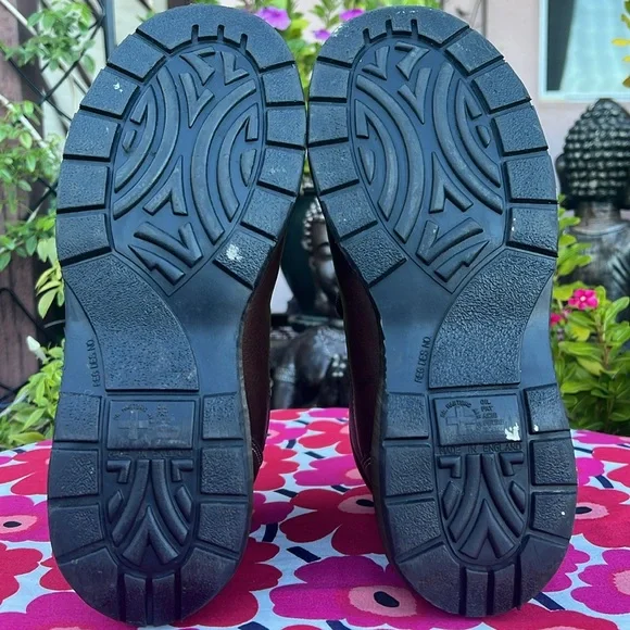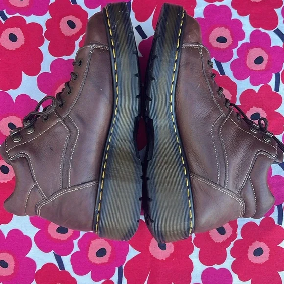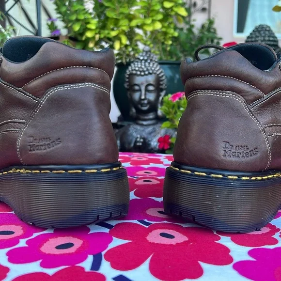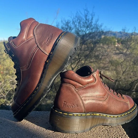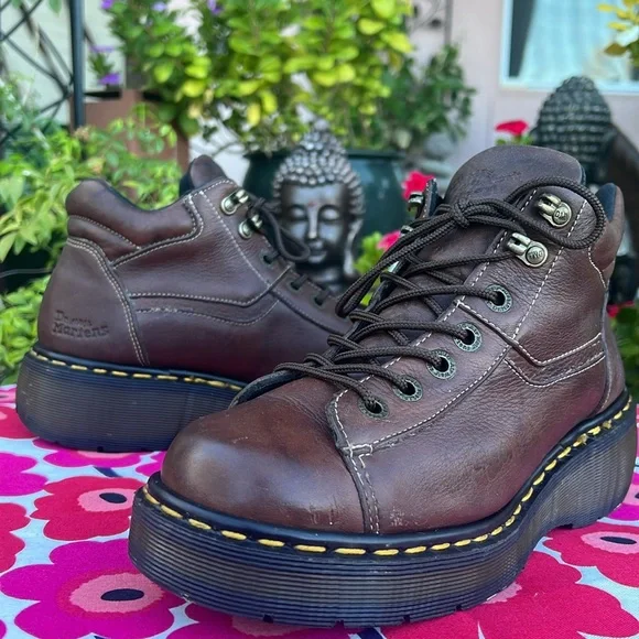 Vintage Dr. Martens Chunky 7 Eye Ankle Boots. Made in England. Smooth chocolate brown leather. Lifted platform fronts elevate to2 1/2 inch chunky soles. 5 eye and 2 speed eyelets at top. Cushiony tongues and ankle collars. Tongues are stamped with oversized “Dr. Martens AirWare” logo. Bright and clean Doc’s trademark yellow welt stitching. Have recently been cleaned and conditioned inside and out! Interiors are nice and clean too. Very good vintage condition❣️ Very minimal scuffing. There are some white spots on soles that could very likely be removed if they bother you. Insoles measure approximately 10 inches. UK size 7. Equivalent to US men’s size 8, women’s 9, EU 41, *per DM’s conversion chart*. P92232DM#England #MIE #madeinengland #vintage #retro #y2k #90’s #9863 #7eye #unisex #deadstock #ankleboots #combat #chunky #platforms #brown #leather #speedhooks #laceup