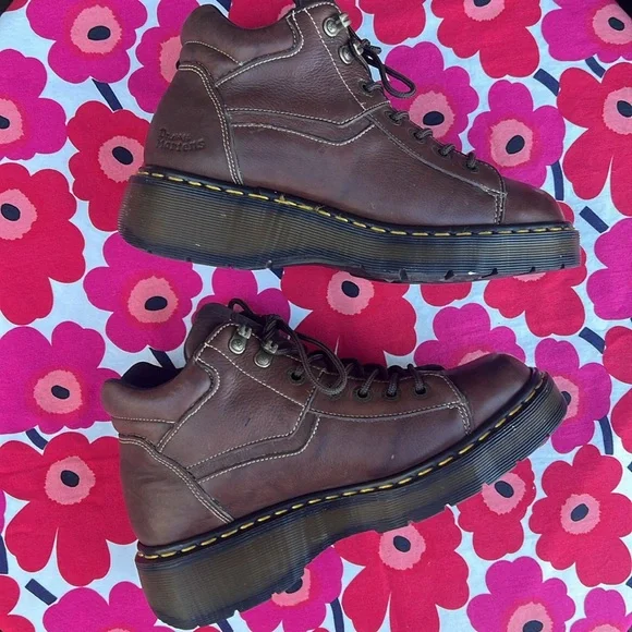 Vintage Dr. Martens Chunky 7 Eye Ankle Boots. Made in England. Smooth chocolate brown leather. Lifted platform fronts elevate to2 1/2 inch chunky soles. 5 eye and 2 speed eyelets...