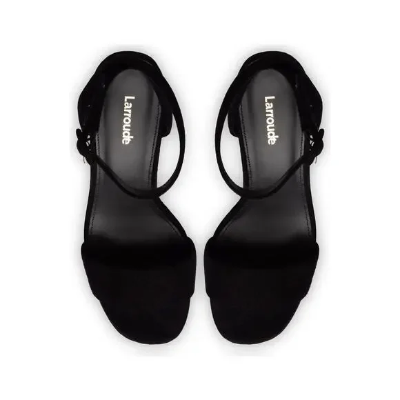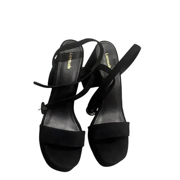 Larroudé Women´s Black Dolly Ankle Strap Platform Sandal Size 12Store return not used. A chunky heel and platform base add a burst of glam to a showstopping sandal flooded with retro-chic appeal. 4 1/2" heel; 1 1/2" platform. Memory foam cushioning. Leather or leather and synthetic upper/leather lining and sole. Made in Brazil.sandal, women, black, ankle, platform, winter, summer, spring, fall, solid, party, cocktail, clubwear, disco.