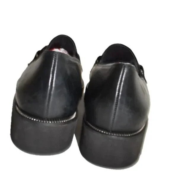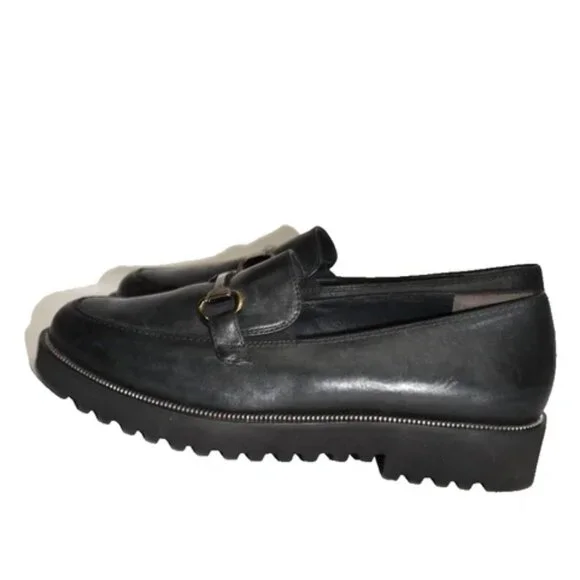 FLOOR MODEL AND TRIED ON - EXCELLENT LIKE NEW - PLEASE SEE PICTUESBLACK COLORRound apron toe; slip onGunmetal-tone bit detail at instepZipper detail at weltLug sole1.5" heel, 1" platform, feels like .5" heelleather upper, leather lining, EVA soleMade in Austriashoes only! no box or bag!