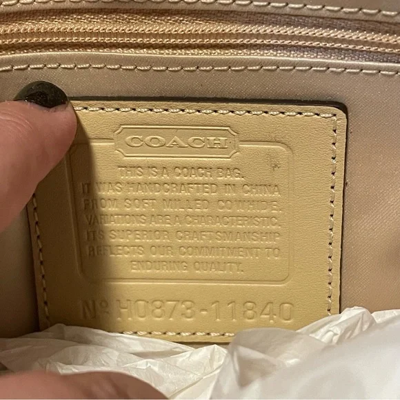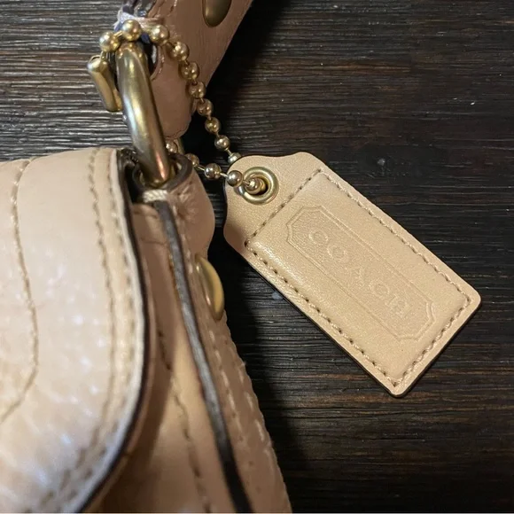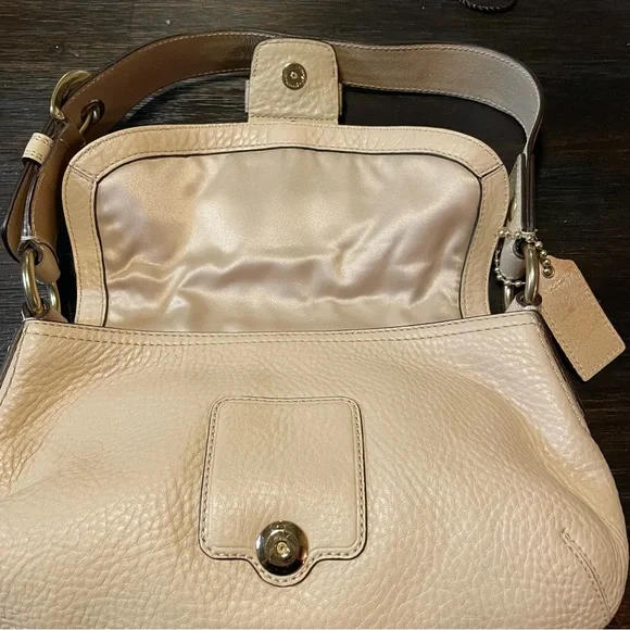 **Authentic Coach bag****Sand colored soft pebble leather. Brass Hardware. Logo embossed hang tag. Buckle Flap with hidden magnetic snap closure. Two front pockets behind the flap. Full length back pocket with hidden magnetic snap closure. Sateen Fabric interior with Zipper pocket, Cell phone & extra pocket. D ring for key fob. AUTHENTIC creed leather inscription with serial #. 11.5" L x 8" H x 4" W. Adjustable leather shoulder strap with 10" drop. New w/o tags, but has original care card inside and paper. Comes with dust bag.