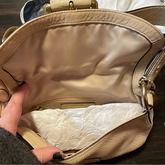 **Authentic Coach bag****Sand colored soft pebble leather. Brass Hardware. Logo embossed hang tag. Buckle Flap with hidden magnetic snap closure. Two front pockets behind the...
