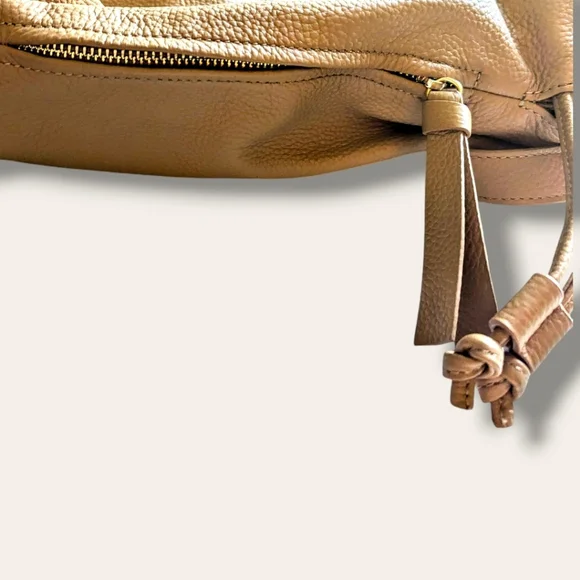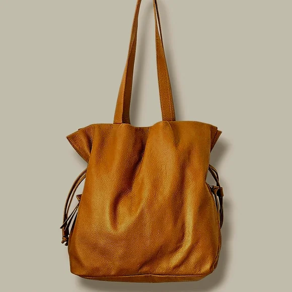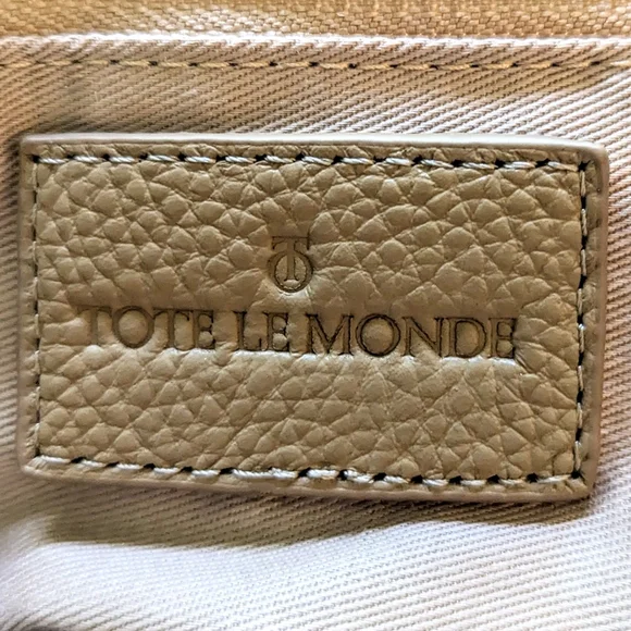 Like New! Casual Luxury Unique bag by Tote Le Monde!!Roma Cinch ShoulderBag/Tote/Bucket BagDesigned by Tia Wou-100% Soft Pebbled Tan Leather-Tan/ Beige Lining-Drawing Pull To Adjust-Two Exterior Zippers on the Sides-Gold Hardware-Latge Interior in Perfect Condition -One Interior Zipper-Measurements: Length 13", Width 15", Depth 13", Strap Drop 11"This bag will go with you! EXCELLENT Like New!! No tears, rips, peeling, dimples in the leather or stains inside or out. * Pictures are taken in various lighting. Boho, Bohemian, Market Bag, Travel, Casual, Roomy Bag/ Purse/Tote