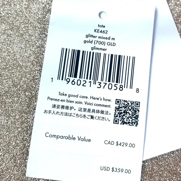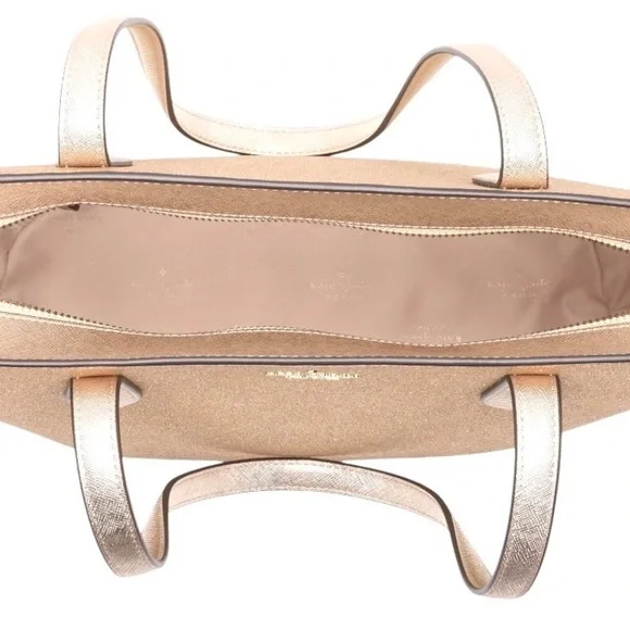 KATE SPADE NEW YORK GLIMMER LEATHER GOLD TOTE BAG. RESALE ITEM $359 RETAIL. Made from a glitter-finished leather, this tote bag features elongated shoulder straps to comfortably carry your essentials in a surprisingly spacious style. 11" H x 17" W x 5.5" D. 25" handle, 11" handle drop. Top zip closure. Two top shoulder straps. Lined. Leather. New with tags