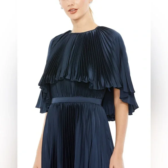 New with tags.Graceful and refined, this tea-length dress features a pleated caplet design that exudeselegance. With its classic silhouette and sophisticated details, this dress is the epitome of timeless style. Mac Duggal Pleated Satin Fabric (100% Polyester)Fully lined High necklineCape sleevePleated detailingConcealed back zipperApprox. 52" from top of shoulder to bottom hemAvailable in Midnight (dark blue)Style #49638Tags: homecoming, pageant, date night, holiday party, gala, wedding guest, military ball, photoshoot, engagement pictures, old Hollywood, red carpet, formal, evening gown, elegant, New Year’s Eve, nye, army ball, marine ball, classy dress, black tie, charity event, guest of wedding, prom, quinceanera, special occasion, mother of the bride Please note due to the intricate nature of the gown, it´s possible there could be a slight flaw (loose string, missing bead or sequin, etc.) After close review, I´m not finding anything major.
