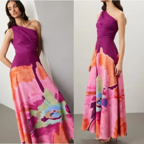 NWT AMUR Atlas One Shoulder Ruched FloralGown Dress Deep Purple Women´s Size 12New With TagsThis AMUR Atlas gown is a brand-new, tag-intact maxi dress in a striking deep purple floral print. Perfect for upscale affairs—such as weddings, formal dinners, or gala events—this gown balances modern sophistication with sustainable, luxe appeal.A-line silhouetteLong lengthSide ruched detailingSleevelessOne-shoulderSide zipper closure100% Recycled PolyesterDey cleanImportedwedding guest, bridesmaid, wedding, gown, cocktail, formal party, new, designer, girly, feminine, classy, classic, formal cocktail party, chic, flirty, formal events, galas, maid of honor