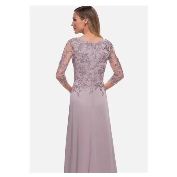 NWOT La Femme Mauve Gown 29251 Long gown with jersey column skirt and lace bodice. High neckline and sheer lace sleeves. Back zipper closure.Size 10. New with tags.Tags: evening, event, formal, cocktail, wedding guest, gala, gown, ball, party, designer, prom, charity, bridesmaid, ceremony, sequin, mother of the bride, modest