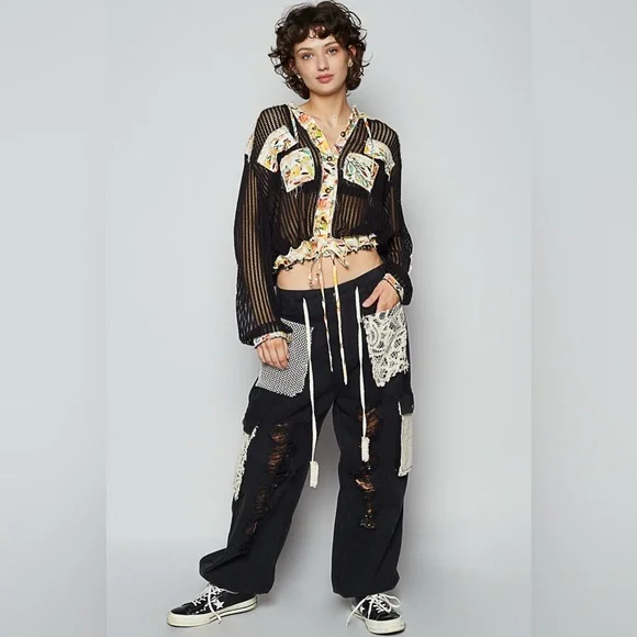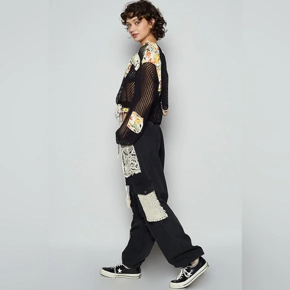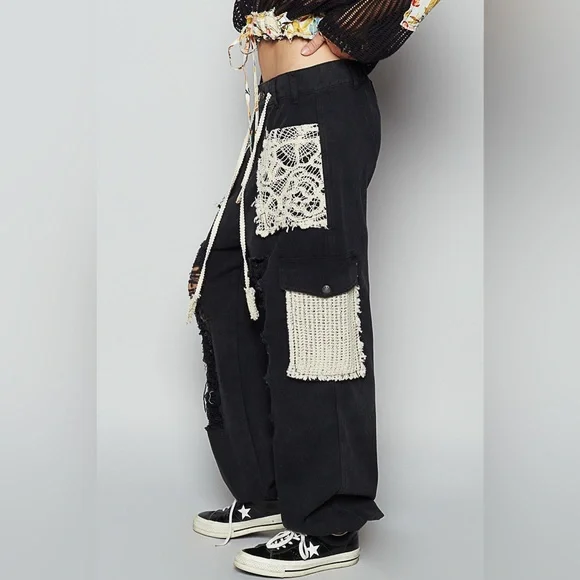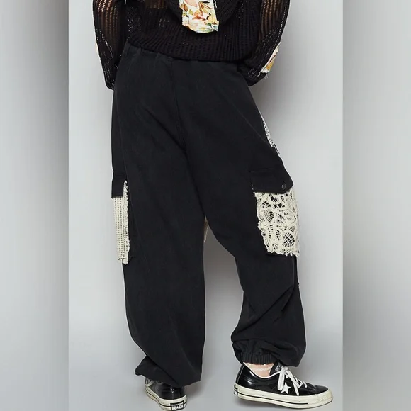 138 Restocked!! POL A17 distressed with crochet pockets jogger pants in black