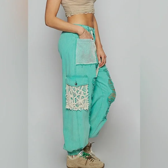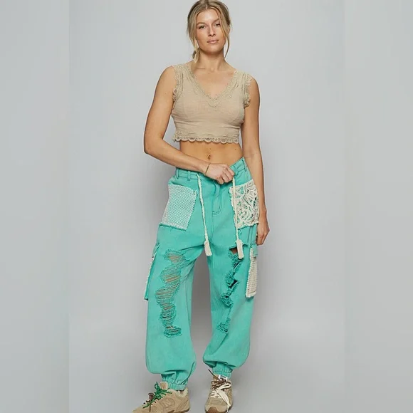 Stylish teal distressed jeans with unique patchwork design. Perfect for a trendy, casual look.DESCRIPTIONDesigned in jogger pants in twill with distress, crochet patch, back elastic band inside, loop, vintage washing, solid color.Fabric Contents:- 100% COTTONApproximate Measurements Laying Flat on the floorSmall:Waist 15" - 17" Rise 14" Inseam 27" Length 40"Medium: Waist 16" - 18" Rise 14" Inseam 28" Length 40.5"Large : Waist 17"- 19"Rise 14" Inseam 28" Length 40.5"Shop our Boutique Collections: POL, Easel, Zenana, UmgeeTops Dresses Jumpsuits Overalls Matching sets Denim Crochet Eyelet LAce Summer Kimono Shacket Cardigan Boho Bohemian Gypsy Cropped Crochet Hippie Beach Paisley Floral Holiday Festival Oversized Granny Square Embellished Pearl Spring Jacket Drop Crotch Jogger Distressed Girly Trendy Y2k Vintage 90s 00s Floral Peace Sweater American Flag Linen Blend Comfy Stylish Sequins Wide Leg Relaxed Flare Patchwork Elastic Stretchable Acid Wash Star Patch Cotton Tropical Leaf Striped Knit Cornflower Color block Flowy Ribbed Ruffle SheerPosh Ambassador with more than 2,000 sold listings! Bundle, save and pay only one shipping! Ships within 24-48hrs.NoAccount? Use this link to sign up and get $10 off on your first purchase. https://posh.mk/UqqcRiomwKb Happy Poshing!