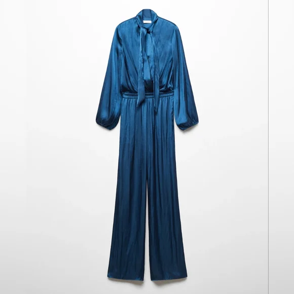 Flowy fabric. Long design. Wide-leg design. Satin finish. V-neck. Bow fastening on the neck. Long sleeve with elastic cuffs. Elasticated waist. Unclosed. Party and events...