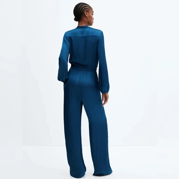 Flowy fabric. Long design. Wide-leg design. Satin finish. V-neck. Bow fastening on the neck. Long sleeve with elastic cuffs. Elasticated waist. Unclosed. Party and events collection.Composition: 100% polyester.