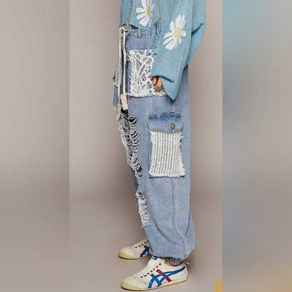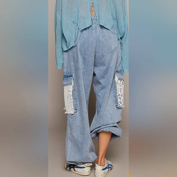 Crochet Pocket Denim Joggers in Olive greenRestocked!!The crochet pocket patchwork detail is so boho and on trend! These denim joggers have an elastic waist and button/zipper...