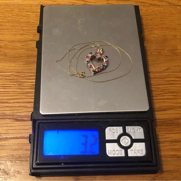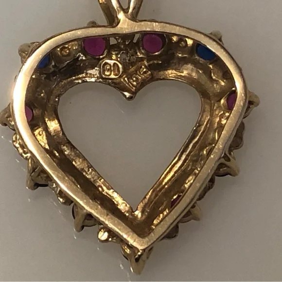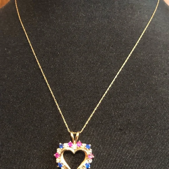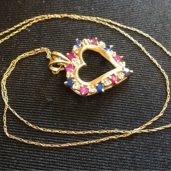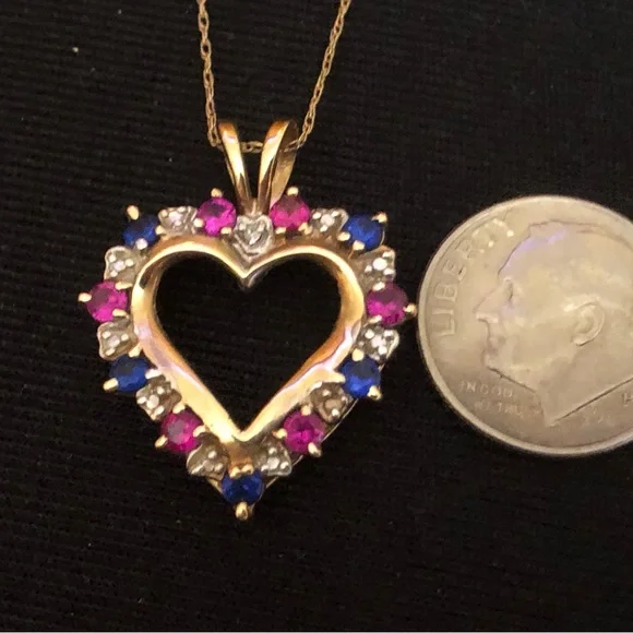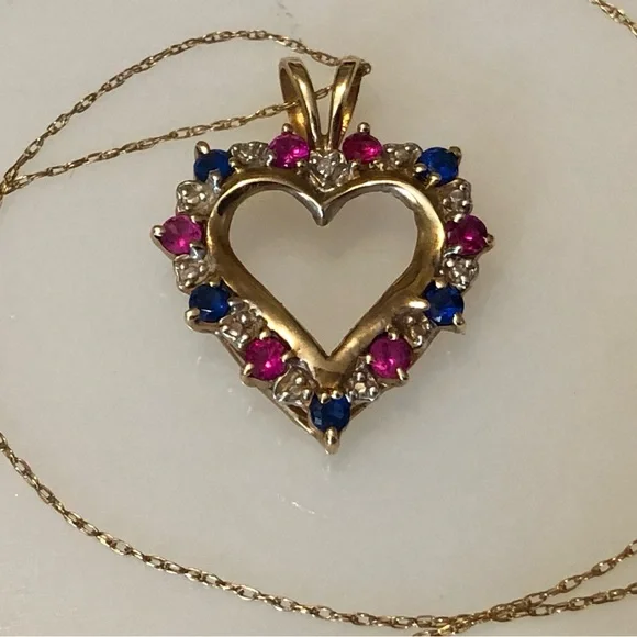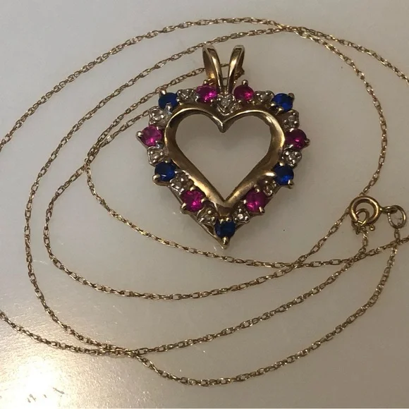 10K Gold Ruby Sapphire Diamond Heart Pendant With 10k Gold Chain Necklace