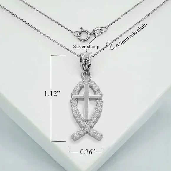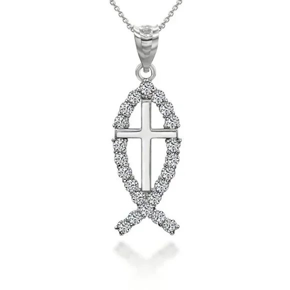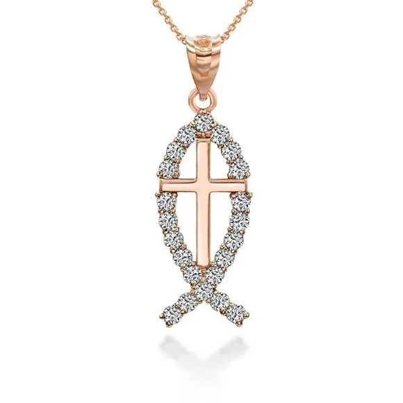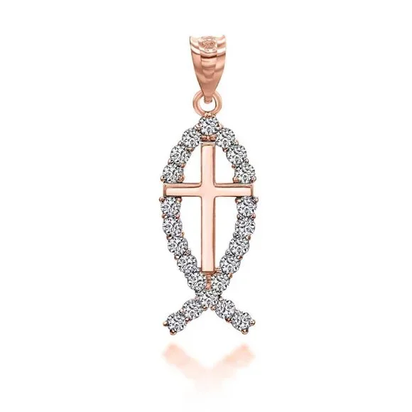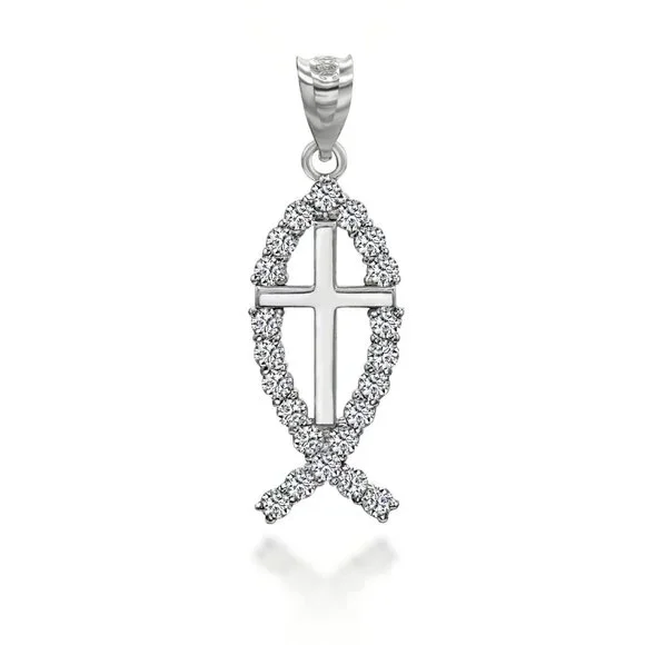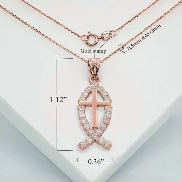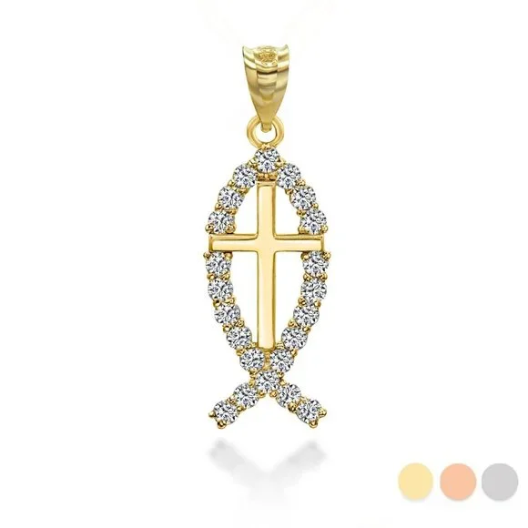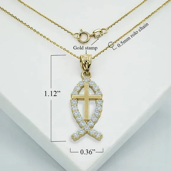 Description: 14k Solid Gold Christian Cross Jesus Christ Ichthus Fish Pendant Item No.:Ba176Metal type: 14k Solid Gold (available in 10k Solid Gold)Metal color: Yellow Gold or White Gold or Rose GoldMeasurement: Height with bail: 1.12 inWidth: 0.36 inStones: Cubic ZirconiaEst. Weight: 1.44 grams (Pendant) . Chain is NOT included. Brand newMade to order. Please allow 3-5 days to be shipped.