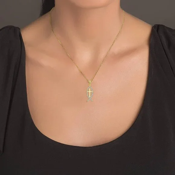 14K Solid Gold Christian Cross Jesus Christ Ichthus Fish Pendant -