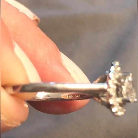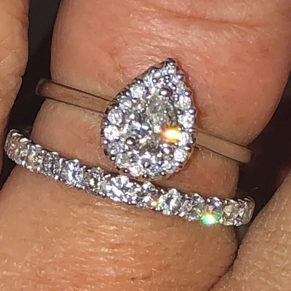 This is a beautiful quality pear shaped natural Diamond engagement or promise ring (band can be sold separately) I’d estimate between 1/3 and 1/2 carat tw. I do NOT have...