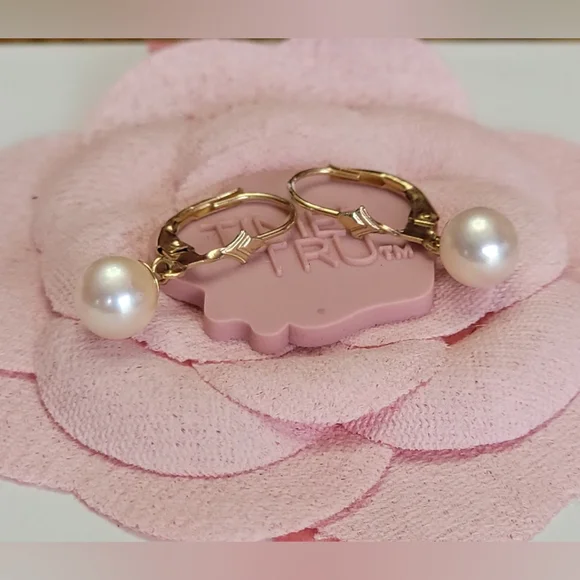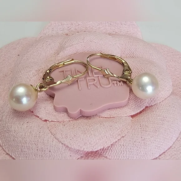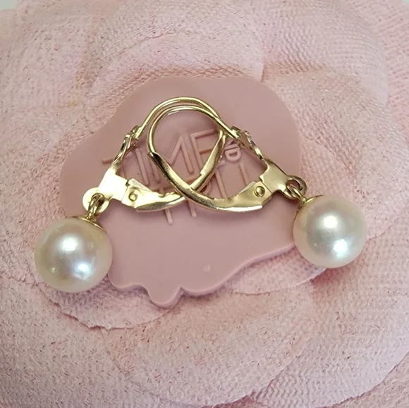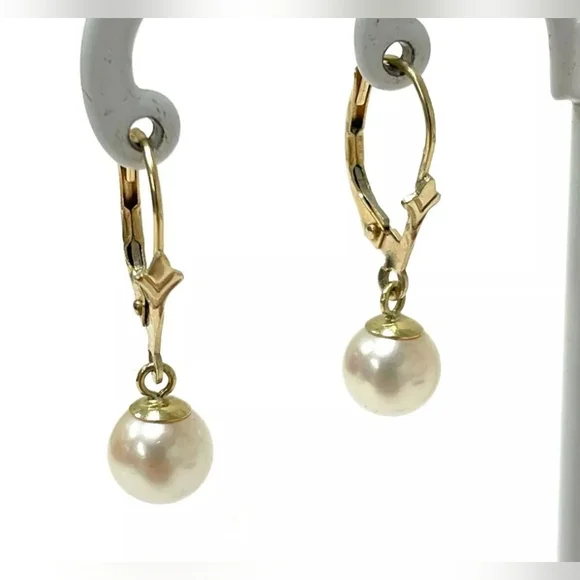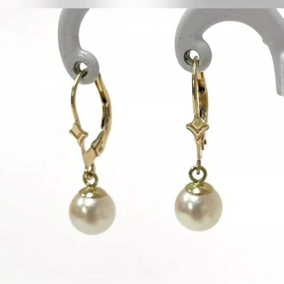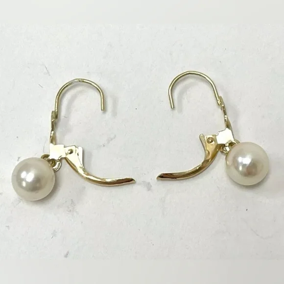 14K Solid Yellow Gold Genuine Pearl Leverback Dangle Drop Earrings