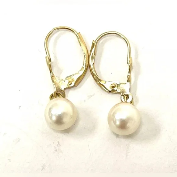 ■14K Yellow Gold Genuine Pearl Lever Back Earrings, 1.6g■Key Features: 14k yellow gold lever back earrings wtih genuine pearl ■Total Weight: 1.6 grams■Stone: pearl ■Stone Measurements:7.0mm approx. ■Overall Measurements: 15/16" drop■Markings: 14K, acid tested■Condition: gently used, minimal wear with minor surface marks