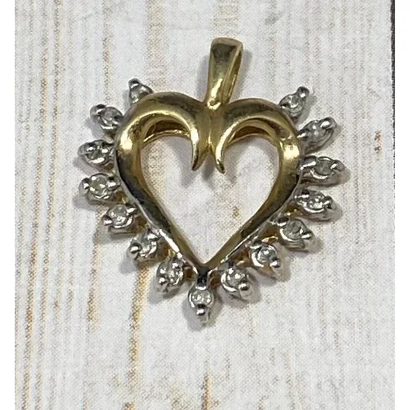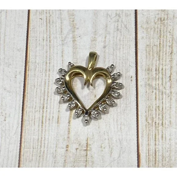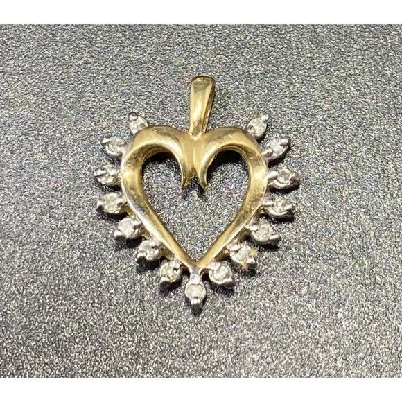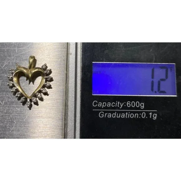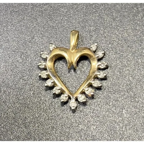 The heart pendant is in great condition and is signed 14k. Features 15 Diamond chips surrounding the heart and weighs 1.2 grams.Please check your pictures as they are part of the description and please ask questions prior to purchase.If I advertise a piece as gold or silver and it is unsigned or unmarked then it has been testedFinally, your feedback is important to us. If you were happy with our service, communication, shipping time, etc let us know but please, prior to leaving a negative or neutral review please contact us and we will do everything in our power to work on a mutually beneficial solution and make it right for you. Customers are #1 and we just want our customers happy with their purchasesFeatures:• Heart, gemstone, 14kSize: Womens 5/8 inCondition: Pre-Owned Good