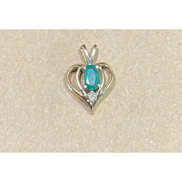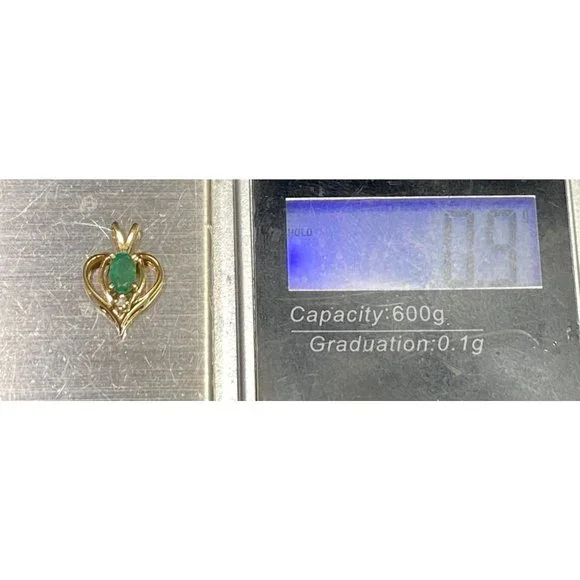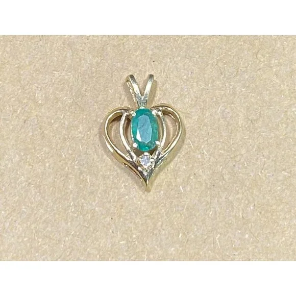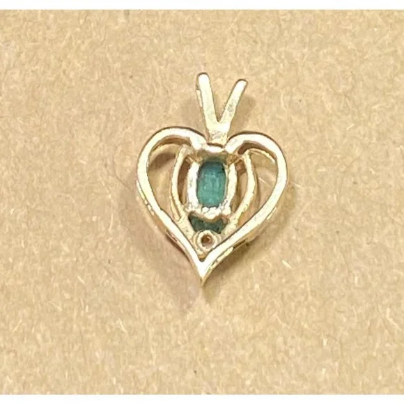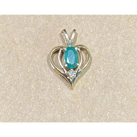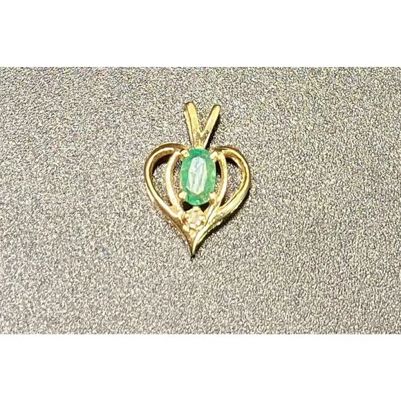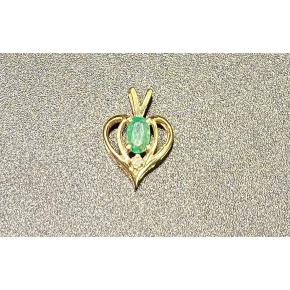14k Yellow Gold and Emerald Heart Pendant Diamond Chip Open Work Fine Love