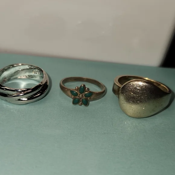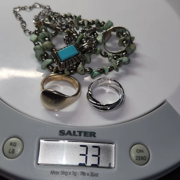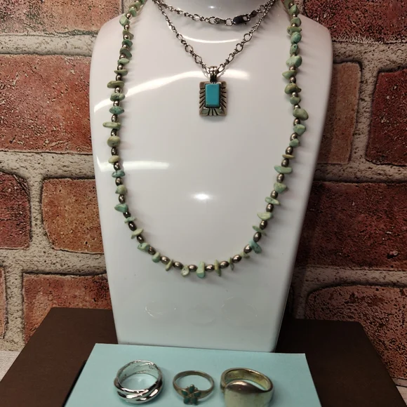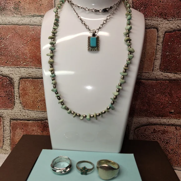 #2264, NATIVE AMERICAN ZUNI, MEXICO , 925 SILVER, REAL TURQUOISE LOT, 33 grs, 5 ITEMS, 2 NECKLACES 15"INCHES EACH, AND 3 RINGS THIS IS A VERY PRECIOUS LOT OF 925 STERLING SILVER, WITH STUNNING REAL TURQUOISE ANTIQUE NECKLACES AND RINGS, THEY ALL MARK AS YOU SEE THE PICTURE, GORGEOUS LOT, THEY ALL IN EXCELLENT CONDITION.