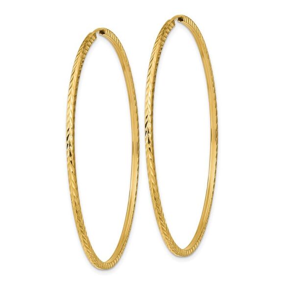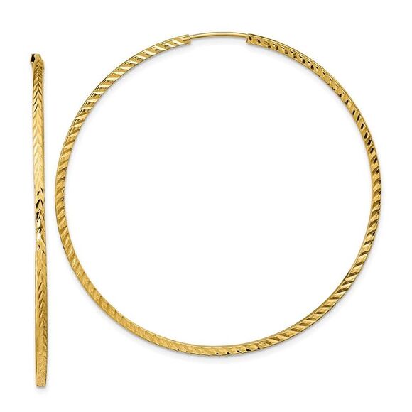 Make a statement with these chic 10K yellow gold hoop earrings. Each hoop measures 55 mm in length and 54.5 mm in width, featuring a diamond-cut texture that catches and reflects light. Sold as a pair, these unisex earrings are designed with a hollow construction for comfortable wear, secured with hidden wire and catch closures.Specifications::Product Type: JewelryJewelry Type: EarringsEarring Type: HoopMaterial - Primary: GoldMaterial - Primary Color: YellowMaterial - Primary Purity: 10KLength of Item: 55 mmWidth of Item: 54.5 mmSold By Unit: PairMetal: 10k Yellow GoldAverage Weight: 2.34 GMEarring Closure: Hidden Wire & CatchEarring Style: EndlessFeature: HollowFinish: PolishedGender: UnisexTexture: Diamond-cutThickness: 1.35 mmModel Number: K-10TF1002-L