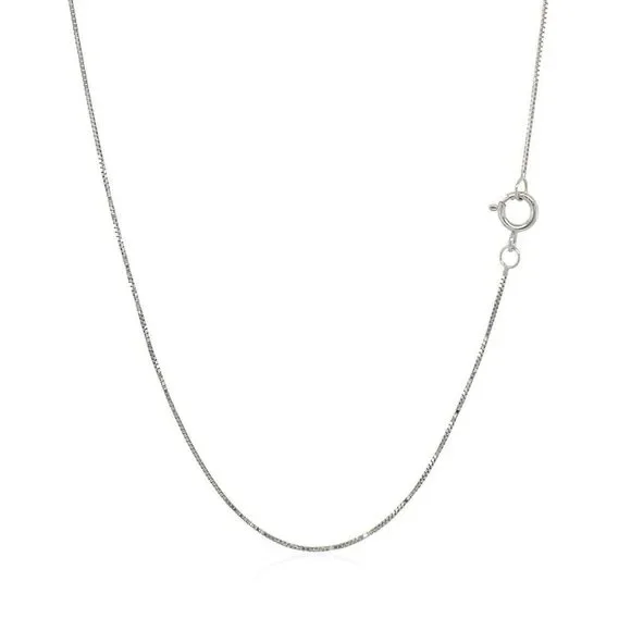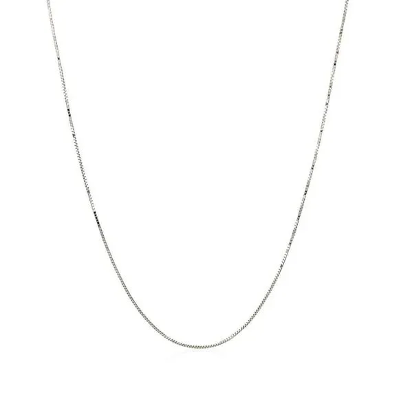 This classic box chain comes in 14k white gold and has a width of 0.45 millimeters.Product Details:Chain Information :Metal :14K White Gold Chain Type : BoxClasp : Spring RingWidth : 0.45 mmApproximate Weight:SizeWeight 16´´ 0.7 grams18´´0.8 grams20´´0.9 grams