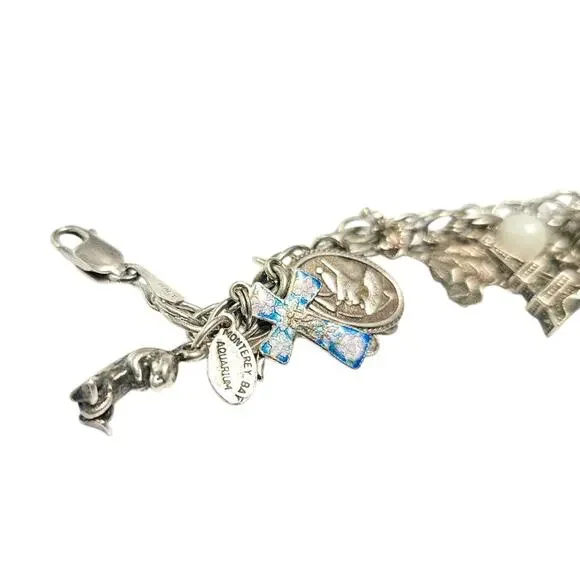 Vintage Sterling Silver Traveler´s Charm Bracelet, 7.5", 17 Sterling CharmsThis vintage charm bracelet, measuring 7.5 inches long, tells a story of travel with its collection of 17 sterling silver charms. Among the highlights are a cameo locket, a Merlion (symbol of Singapore), and a pyramid (likely representing Egypt). A particularly charming piece is the Spaniard flamenco dancer.The charms represent various destinations, including Egypt, France (Eiffel Tower), Spain (flamenco dancer), and Monterey, California (seal). The longest charm measures approximately 1 1/4 inches. Please note that two enamel Disney charms, a brass Virgin Mary charm, and a faux pearl charm are not sterling silver and are part of the total of 20 charms. This bracelet is a unique memento of past adventures.