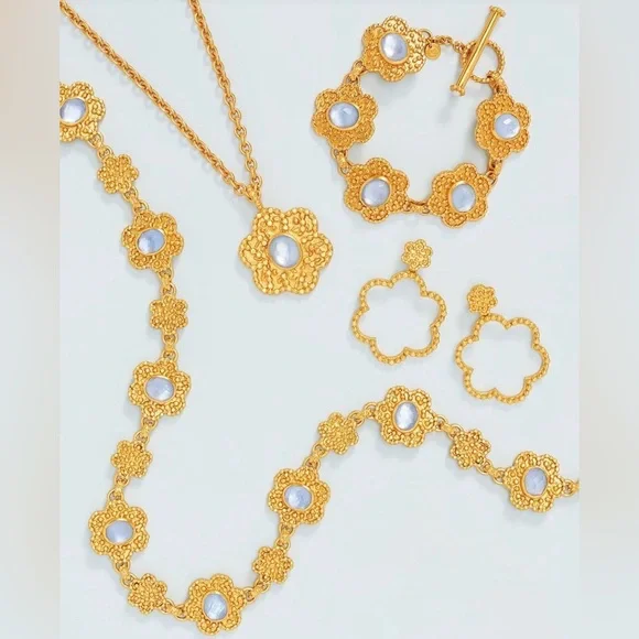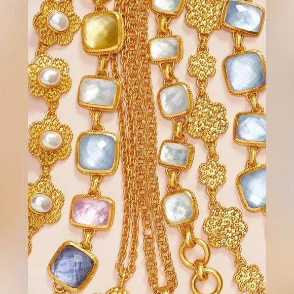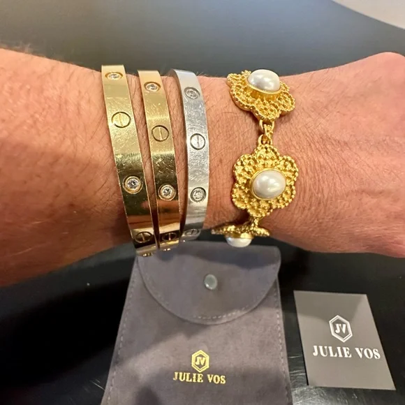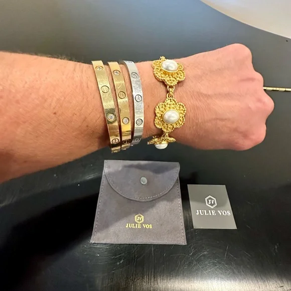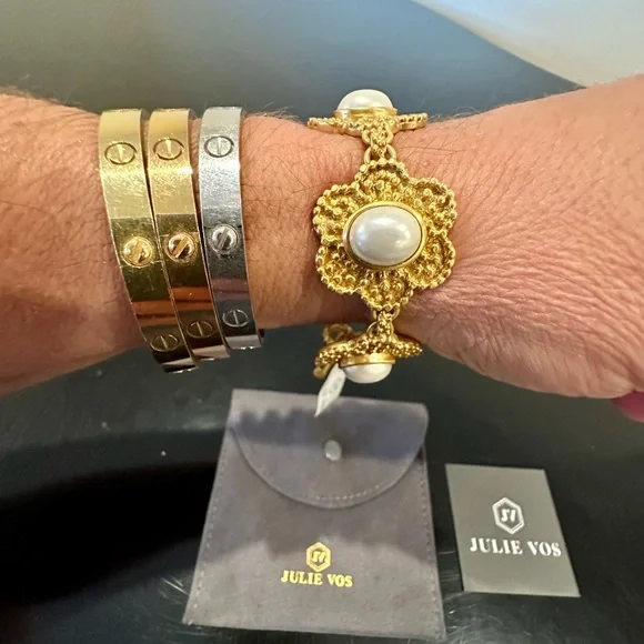 Authentic Rare Julie Vos Flower Pearl Stations Statement Bracelet-opulence radiates through every detail of this stunning bracelet, matching necklace listed, large lustrous pearls bezel set in 5 flower stations,each pearl station is about 1” x between .75” - 1”,beaded detail-little over 7.5” L including toggle,adjustable w/2 rings, lightly hand hammered toggle closure, charm w/JV hallmark & small CZ next to it on one side,JV hallmark on other-one side w/pearl & beaded detail,other side is 24K gold plated brass w/subtle hammered detail, slight intentional curve in flower stations so sits nicely on wrist-Julie Vos jewelry is designed to be your daily dose of luxury,jewelry brand classically inspired & richly luxurious,earning a devoted following & sobriquet "wearable luxury”-pearl,cubic zirconia,24K gold plated over nickel free brass,sealed to prevent tarnish-Julie Vos pieces are designed & HANDCRAFTED to standards of fine jewelry, each pearl is unique & has own characteristics,same w/24k gold plated brass,any unique characteristics of pearls & metal is because handcrafted, posted pics of pearl that have natural unique characteristics, not damaged, posted pic of back to show unique characteristics of metal plating, hand made, same w/toggle-RARE,SOLD OUT-original Julie Vos pouch & product info/care instructions included, they recently changed design of card-included stock pics of other colors & items, I’m selling ONE flower pearl bracelet-gift w/purchase