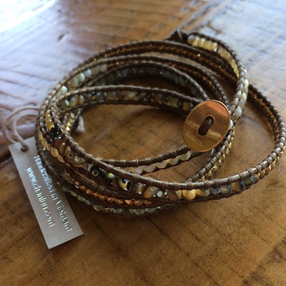 From the Chan Luu SIGNATURE Collection. Beautifully handcrafted 32" multi wrap bracelet features strands of kanza leather surrounding an array of multi hued semi precious labradorite stones and 18k gold plated sterling silver nugget beads. Gorgeous!!!Made in Vietnam. No trades ever. Price firm unless bundled.