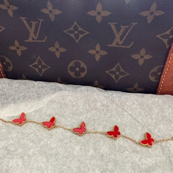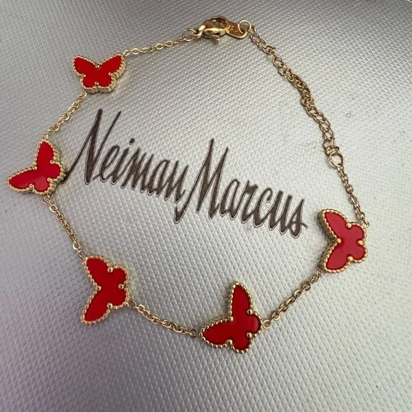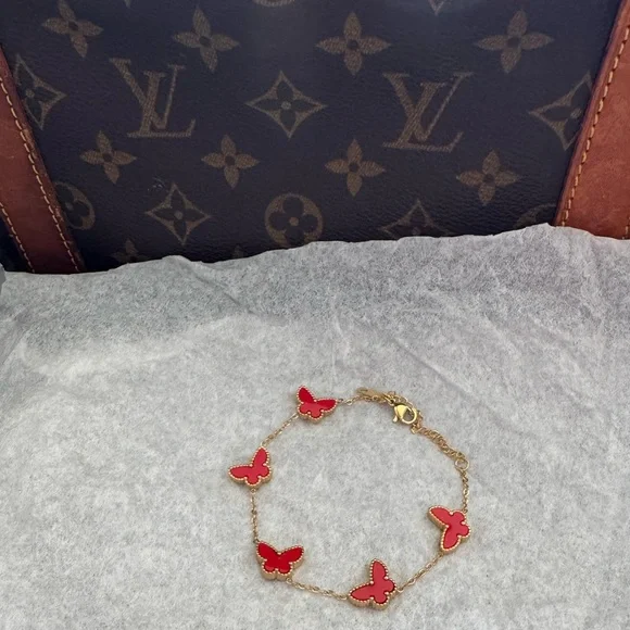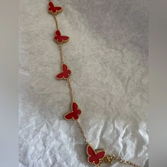 New!Lucky Red Carnelian Butterfly Motif Bracelet.5 Butterfly Motifs18k yellow gold finish High Quality Luxury Jewelry No tarnishAdjustable: 6” - 7.5” inches Made in France...