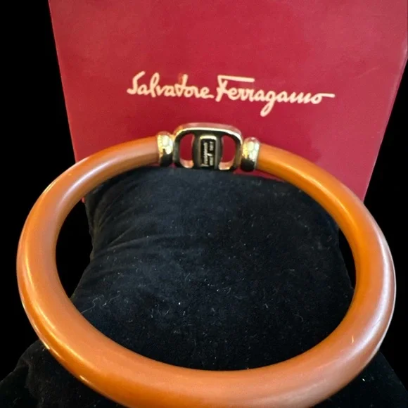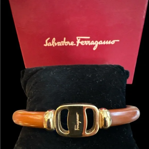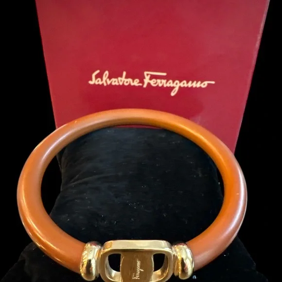 Chic Salvatore Ferragamo bangles in tan & gold. Simple and stylish design.Item is Preowned.Bracelet may show minor signs of rubbing, scratching, tarnish, or oxidation. Hardware in good working order. Rating C conservatively.Fits 5-5.75 inch wristZ: Brand-new or New with tagS: Like new,only used a couple timesA: Excellent condition no noticeable damageB: Good condition light sign of usedC: Ok condition signs of regular used with scratches, creases, and/or stainsD: Used condition may have light damageE: Bad heavily used, have damageW: Junk badly damaged must check explanation.Please refer to photos and/or video as they are part of description. Do not bid or make offers if you have questions or concerns-ask first-I am happy to help. Please understand that unless an item is listed as new or like new that it is preowned and will likely show signs of storage odors, wear, or use. Please manage your expectations when purchasing a preowned item. Items sold as is. Bid responsibly