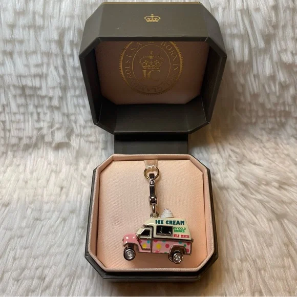 Juicy Couture Ice Cream Truck CharmName: Ice Cream Truck Style #: YJRU4919 Year released: 2011Description:Pink ice cream truck with polka dots and spinning wheels, opens in the middle to a hollow center.Details:Due to the vintage nature of this item it may contain discoloration, tarnish and or pitting. Items may be pre-loved / worn and may show signs of wear. Any major flaws will be noted in the product description and shown in the images. Style Tags:Collectable, Charm Bracelet, Crown Logo, Discontinued, Gold Tone, Hard to Find, HTF, Juicy Couture, Mr. Softie, Nostalgic, Pave Crystals, Rare, Retired, Retro, Very Hard to Find, VHTF, Vintage, Y2K