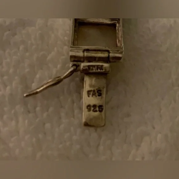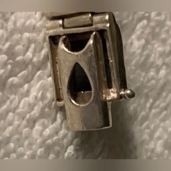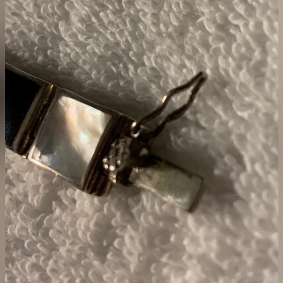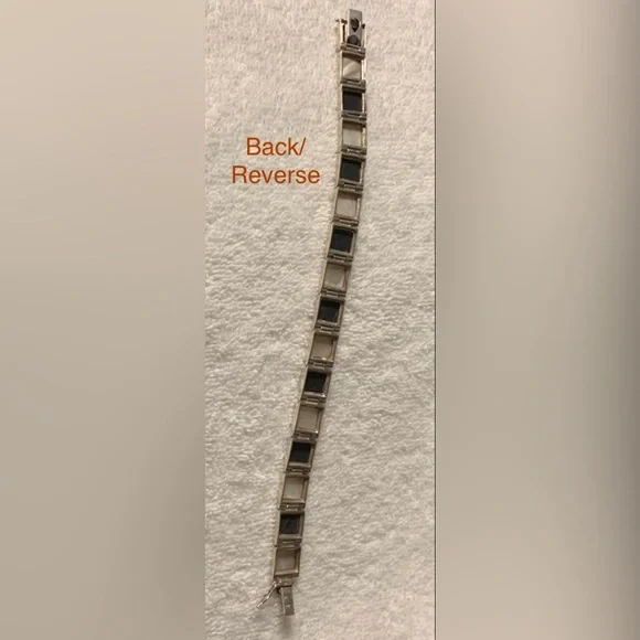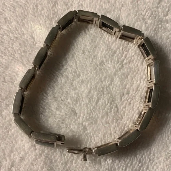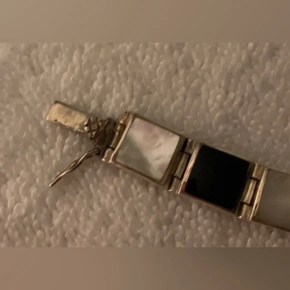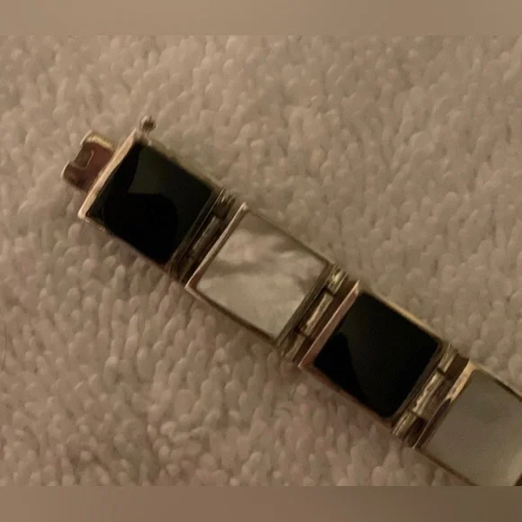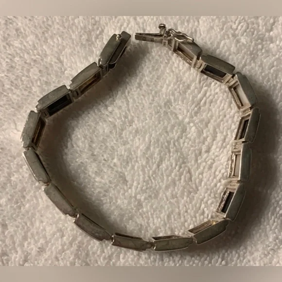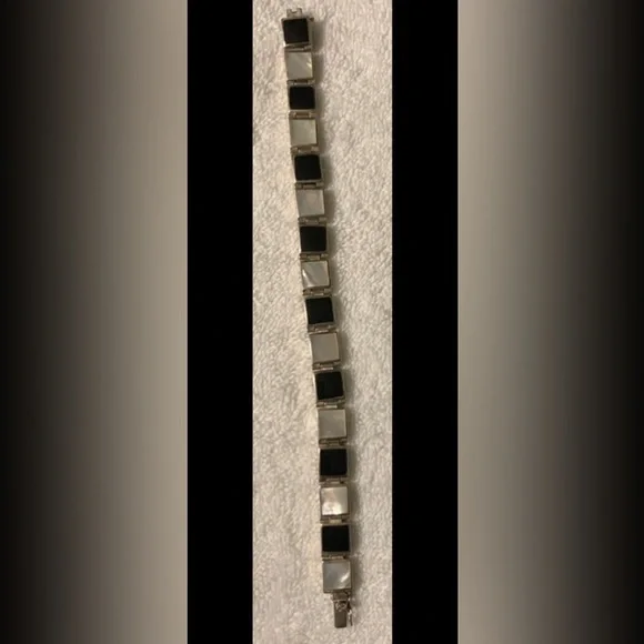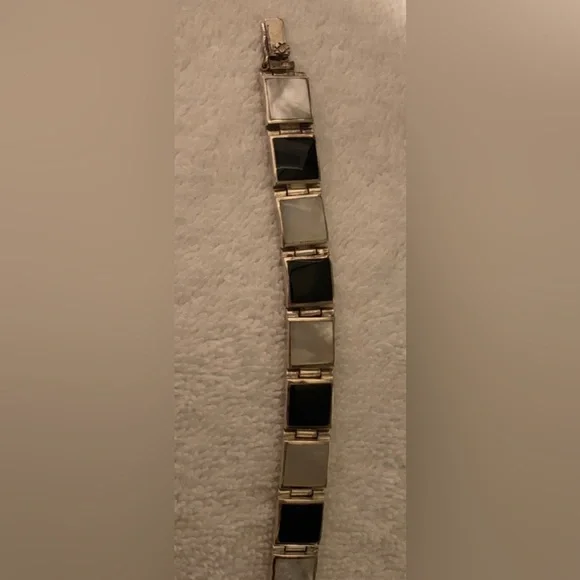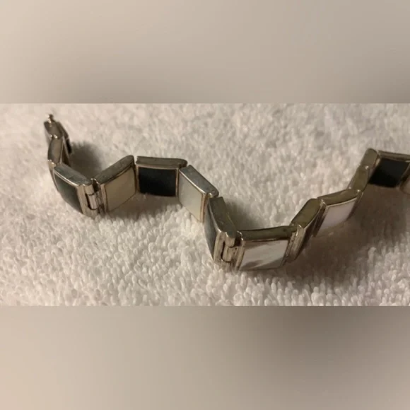 VTG Black Onyx & White Mother of Pearl Sterling Silver Link Bracelet FEATURES• Handmade, w/Characteristics & Unique Charm Inherent to Such Pieces• Has eclectic mixture of vibes: Southwest, Art Deco, Minimalist, Modernist• Thai Sterling Silver Settings, Connector Links & Clasp• Sixteen (16) Bezel-Set Square Links: Eight (8) Black Onyx & Eight (8) White Mother of Pearl• Tab & Box Closure w/Side Safety Click Clasp• Overall Length 8 1/4” (8.25”)• Each link approx. 10mm square• Stamped:THAI925FAS• 925 and FAS (Fused Alloy Silver) describe the piece as being made of 92.5% Sterling Silver.• THAI stands for ThailandCONDITION• Vintage (VTG)• Very Good Used Condition• Some minor wear commensurate w/age & use.• Refer to photos for features & condition• Due to variations in browsers & monitor resolutions colors may appear slightly different in person.• Lightly cleaned & polished to showcase features.• Smoke-free/Pet-freeThank you for looking!([J016b]/J1030)mp