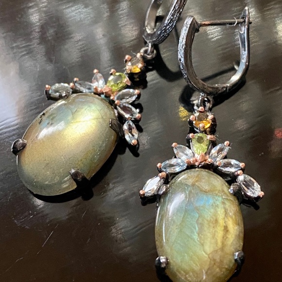Classy elegant 925 sterling silver earrings with high quality genuine Labradorite cabochons, accented with high quality genuine Topaz, Tourmaline and Peridot. Beautiful unique...
