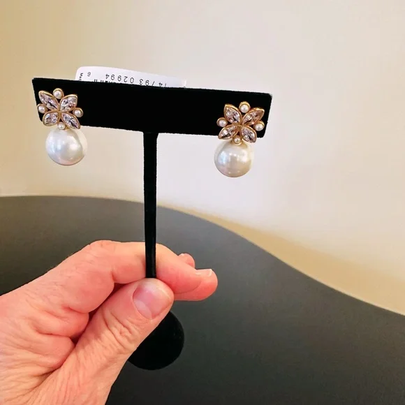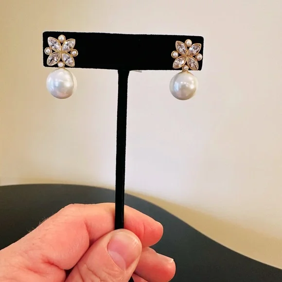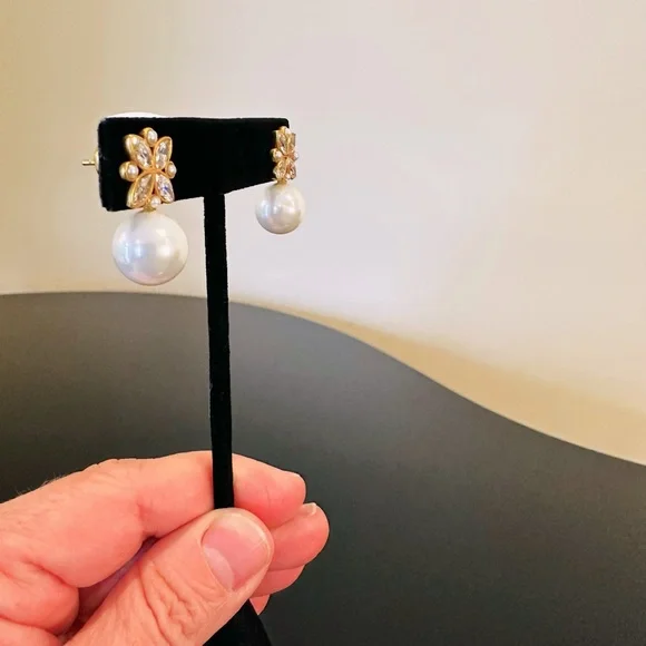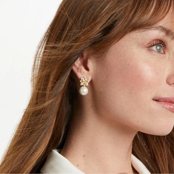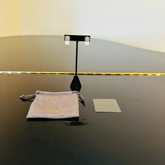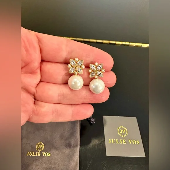 Julie Vos Authentic Luxury Minimalist Wedding Party Bride RARE Pearl CZ Drop Earrings-Need a wardrobe refresh,add some major glamour into your jewelry collection w/these STUNNING JV pearl & CZ drop earrings-Luminous substantial 12 mm shell pearls (about .5" W) suspended from shimmering cluster of marquise-cut CZ & delicate freshwater pearls-about 1" L-for pierced ears,sig JV earring backs w/JV hallmark & small CZ, JV hallmark embossed on back of earrings-24K gold plated over nickel free brass & sealed to prevent tarnish,can tell from rich color that24K gold plate-Julie Vos pieces designed & HANDCRAFTED to standards of fine jewelry,each pearl is unique & have own natural characteristics, any unique characteristics of CZs, metal work, plating, because handcrafted, any differences in pearls or nacre is because not man made, natural characteristics, very tiny parts of metal work on back of one earring, top of one earring & earring backs not as smooth as rest, because meticulously handcrafted-orig JV pouch & product info/care instructions included-SOLD OUT ONLINE, RARE-look at pics as help describe item-will include more than one nice gift w/purchase, look at my reviews-other listings:David Yurman, Ferragamo, Majorica, , , Zara, J. Crew, Vineyard Vines, Theory,Kendra Scott, Anthropologie, Kate Spade,Michael Kors,Zac Posen,Ray-Ban, Cartier, Tory Burch, Burberry, Alexander McQueen, Ted Baker, Free People,Tiffany & Co.,Louis Vuitton, St. John, ESCADA, Lululemon