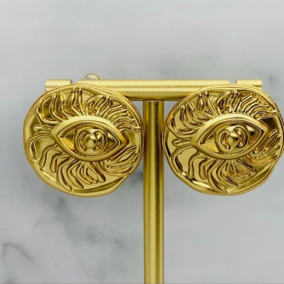 Elegant gold earrings featuring a unique eye motif. Perfect for adding a touch of sophistication to any outfit. gold plated over S925 silver, no tarnish , studs. made in France. these are the small eyes , costume jewelry care . box sold separately in the store