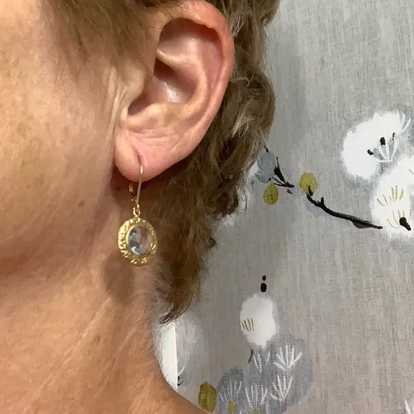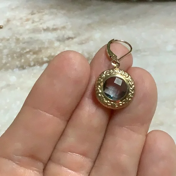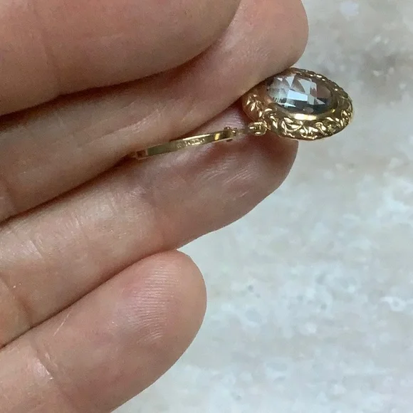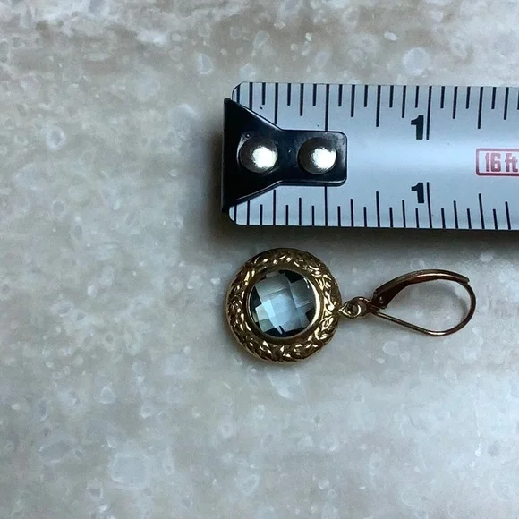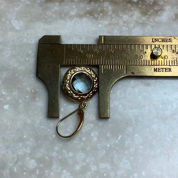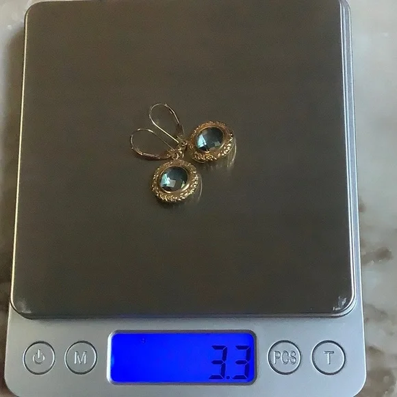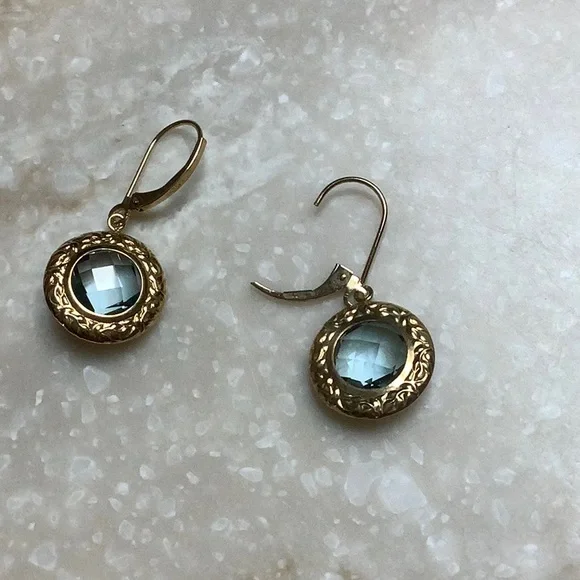Beautiful 14kt gold and aquamarine earrings! Faceted center aquamarine gemstone. Intricate vine design around the outer edges of the earring. Lever back closure. 14kt mark on the closure. The weight of 3.3 grams does include the gemstone. Some devices may allow for the variation in stone color. Gorgeous earrings! Never worn. Excellent condition. Smoke/pet free environment.
