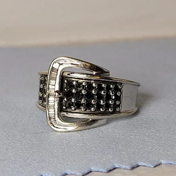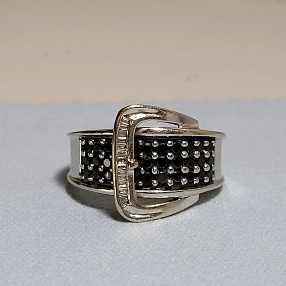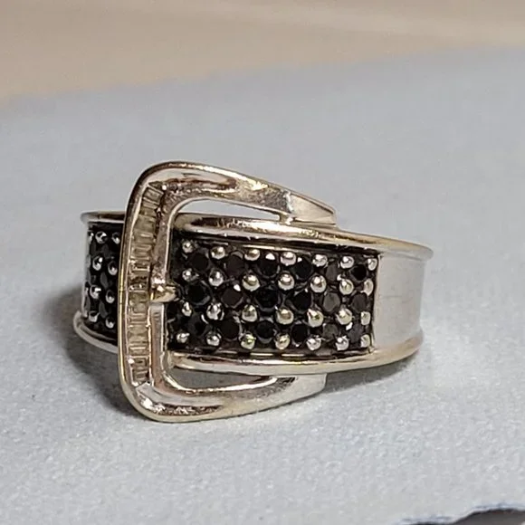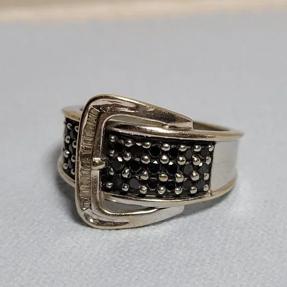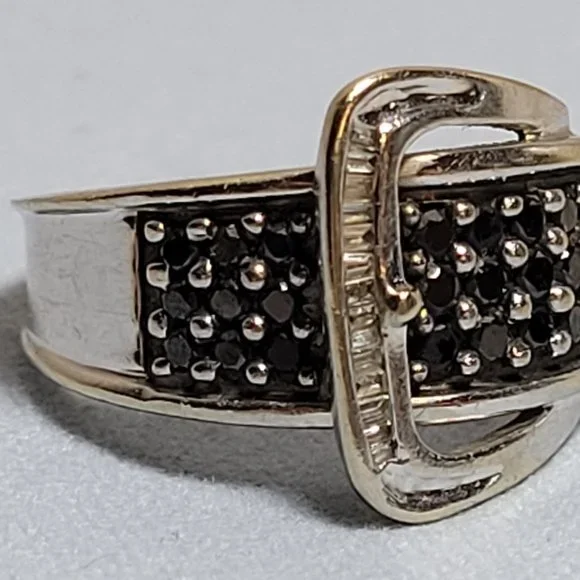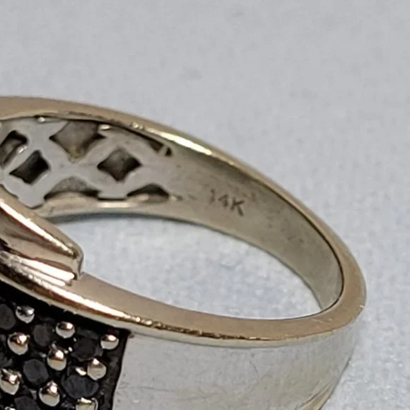 14k white gold band with approximately .50 ctw of round black natural diamonds (27 total) and white baguette natural diamonds. Stamped ´14k´. Ring size 5.5. Good used condition! The band does show some scratches if you look very closely. Can be taken to a jeweler and polished up nicely.This ring sells elsewhere online for $499+.