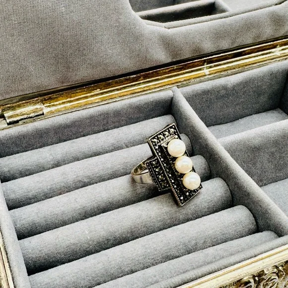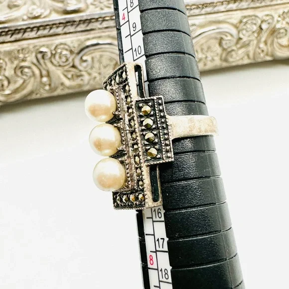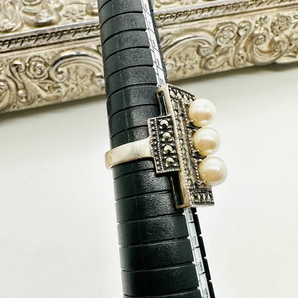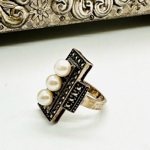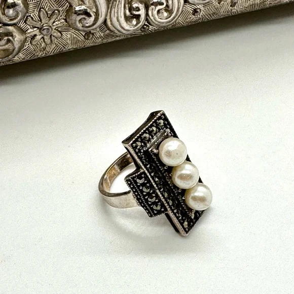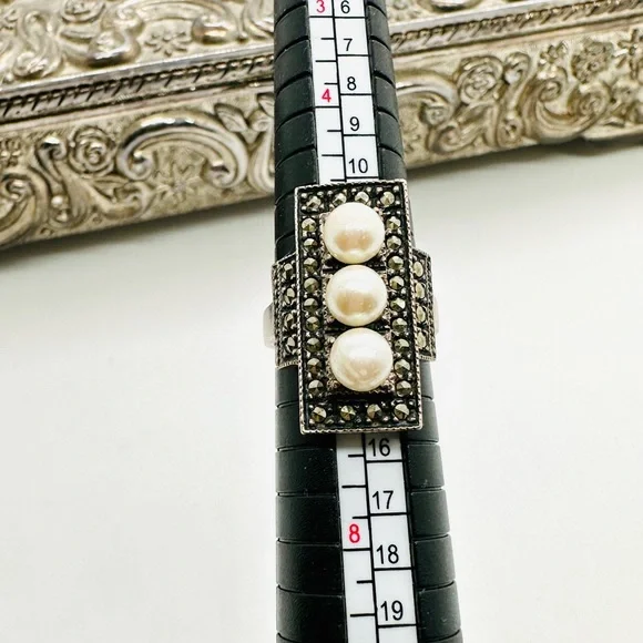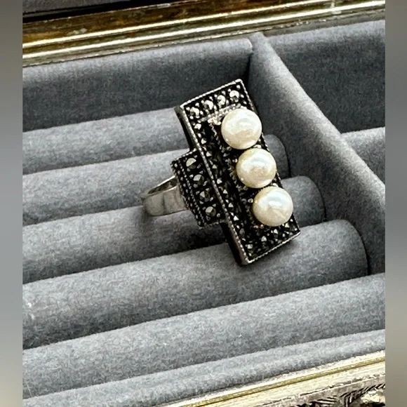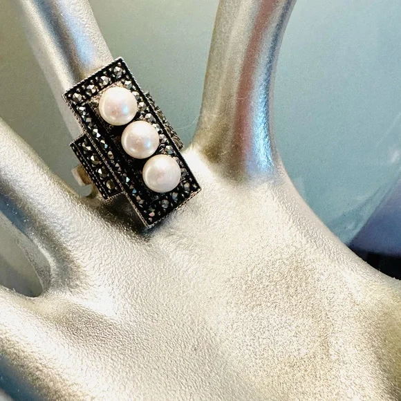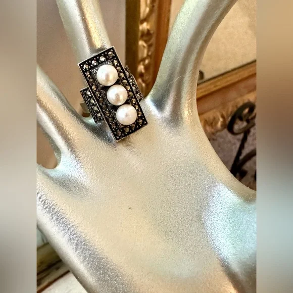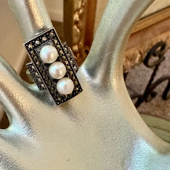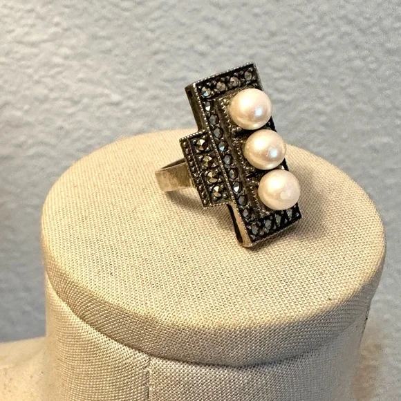 Gorgeous! Vintage Sterling Marcasite Cultured Pearl Statement Ring.Signed STERLING and a makers mark hallmark. Possibly antique ?Silver has a nice patina and will need a detailed...