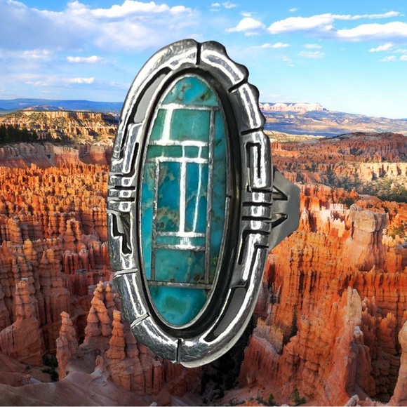 Created by award winning, Navajo artist Gilbert Nelson. He is a master of inlaid, native jewelry and uses only the best material for his work. This elongated ring is 1 3/8 inches...