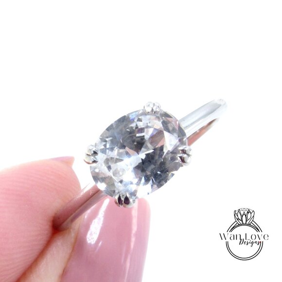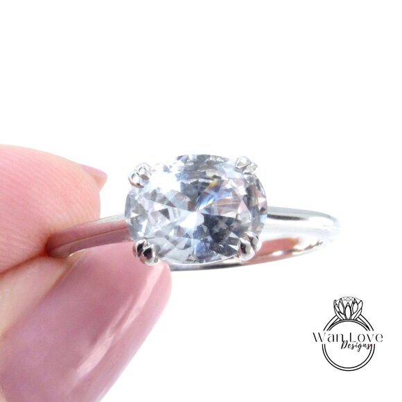NEW! White Sapphire Oval East West Engagement Ring, Double Prong solitaire minimalist bridal ring Wedding Anniversary Gift ring-Ready to shipMakes the perfect Anniversary gift, Wedding gift, Mothers Day gift, Birthday gift, Holiday gift or just to say I Love You gift!! Looking for something in particular/custom? Please ask for details & pricing.~Ring Details~Metal-925 Silver Dipped in Rhodium (in the Platinum family)Size-6.5 (Can be resized-Silver for $50, Gold for $75 sizing down, ask for sizing up price. **Please ask for a Custom Listing Prior to purchase. Resizing may take approx a week)~Center Gem~Type-Sapphire (Lab grown, same properties as natural)Weight-2.5-3ct (approx)Size-9x7mmColor-WhiteClarity-VVSCut (shape)-OvalAbout Lab Grown gems-They are identical to their naturally grown counterparts (same hardness, refractive index, etc). The exception being, grown in a lab, rather than the earth. The clarity & color are also able to be controlled producing gorgeous near flawless gems that you would normally pay $1,000s for. They are genuine Corundum (same as Sapphires & Rubies in nature).♥ Designed and Hand Created Just for you in the US, by WanLoveDesigns ♥Thank you for supporting our small family business!! Looking forward to Creating the Design of your Dreams! Wan Love!