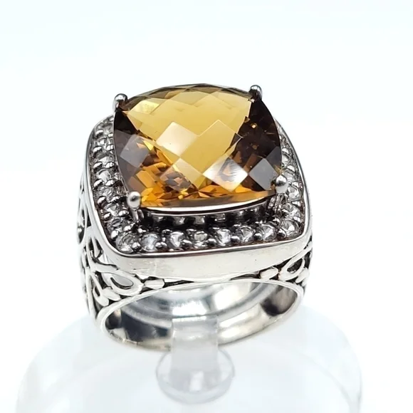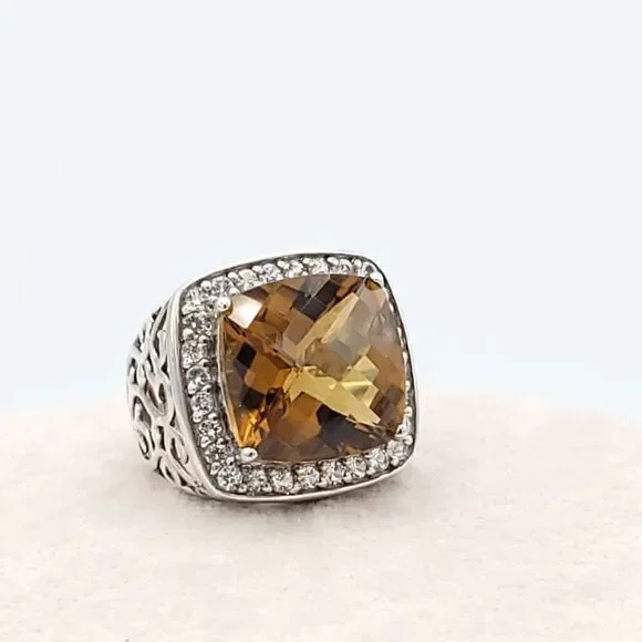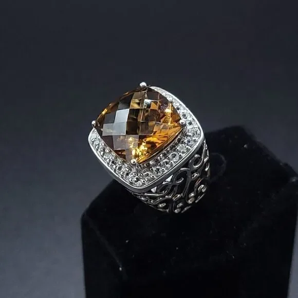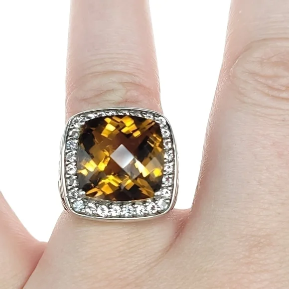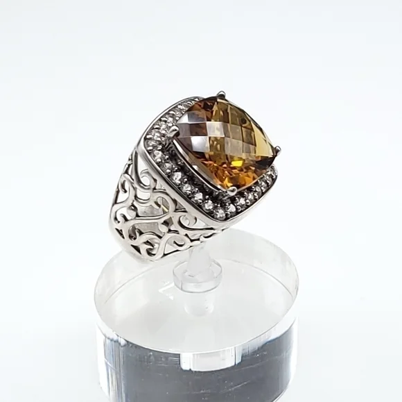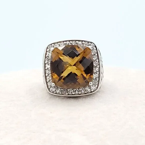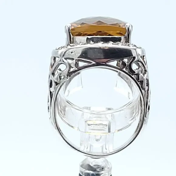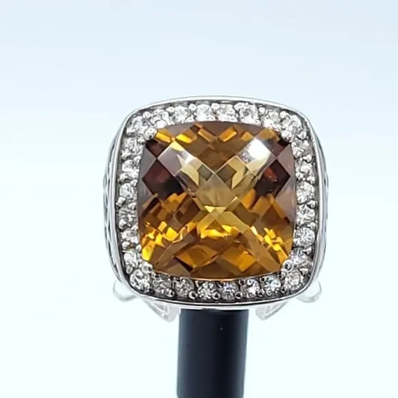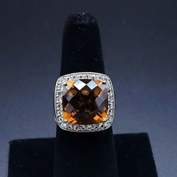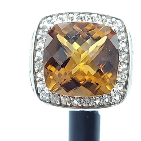 Gorgeous statement ring!!!Yellow-orange Honey Topaz is 10.5 carats with a halo of white sapphires set in rhodium plated sterling silver (will not tarnish!!) Size 7 - can be sizedOverall size is 20mm x 19mm Honey Topaz is 14mm x 14mm