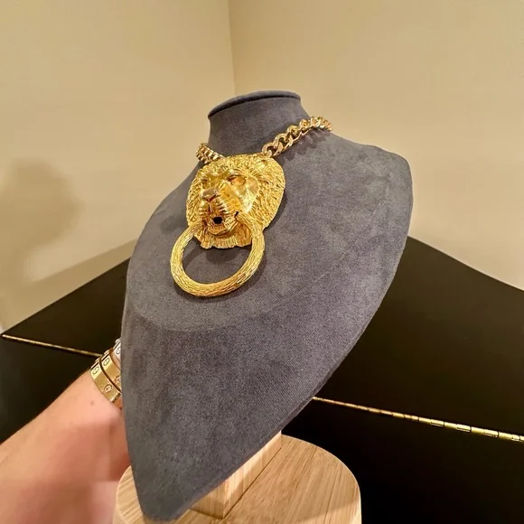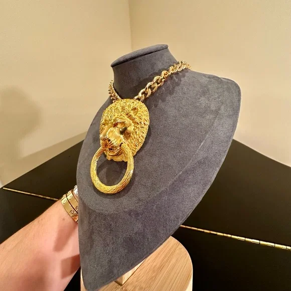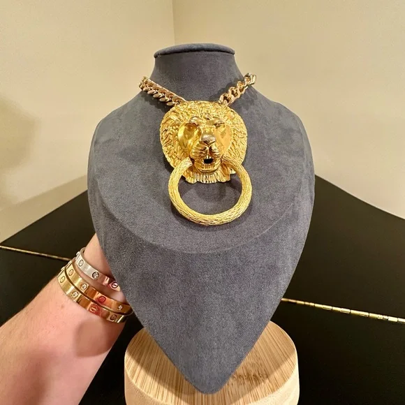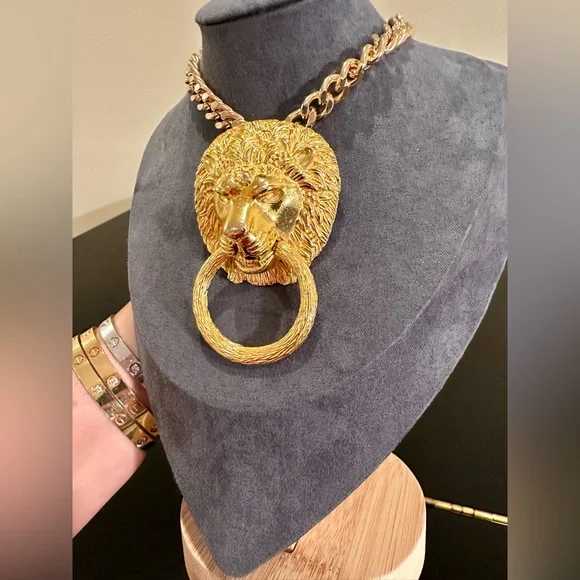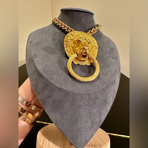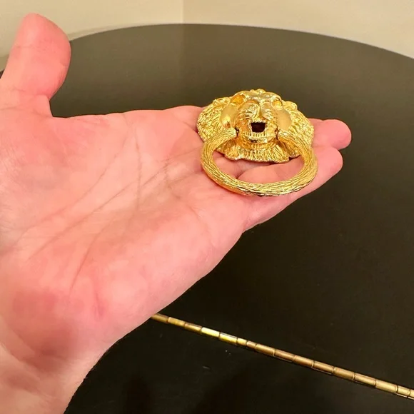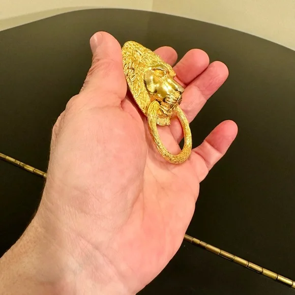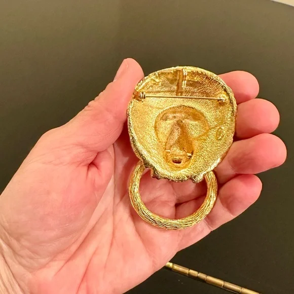 Authentic Runway Vintage Retro Luxury RARE Kenneth Jay Lane Lion Door Knocker Brooch/Pendant-VINTAGE 1990s EXQUISITE STUNNING Kenneth Jay Lane signed Lion´s Head Door knocker brooch pulling double duty as pendant-chic, couture, runway designer, majestic brooch featuring large lion’s head w/textured detail-in very good vintage preloved condition, signed KENNETH LANE w/© symbol next to it on plaque on back-about 3" L x about 2" W-Crafted w/exquisite artistry, nice quality weight-KJL uses only highest quality material in making their jewelry, there are many layers of meticulously done gold plating to ensure a "high end" look to the designs, enabling you to enjoy KJL pieces for years to come & pass them down-rare find in this condition, very important, sought after & well known piece in his collection, even more beautiful in person, I have lion´s head earrings listed-back has brooch closure w/safety catch & open hook to wear on chain, pearls...as pendant, chain not included-look at video & pics as will help describe item, check out my reviews, gold plating & metal work not smooth all over, how intentionally made, minor tarnishingunder his mouth, two small spots on edge & back, expected for preloved vintage piece, one very small part on edge that has tarnishing isn´t completely smooth-will include more than one nice gift w/purchase-SOLD OUT ONLINE & IN STORES, VERY RARE
