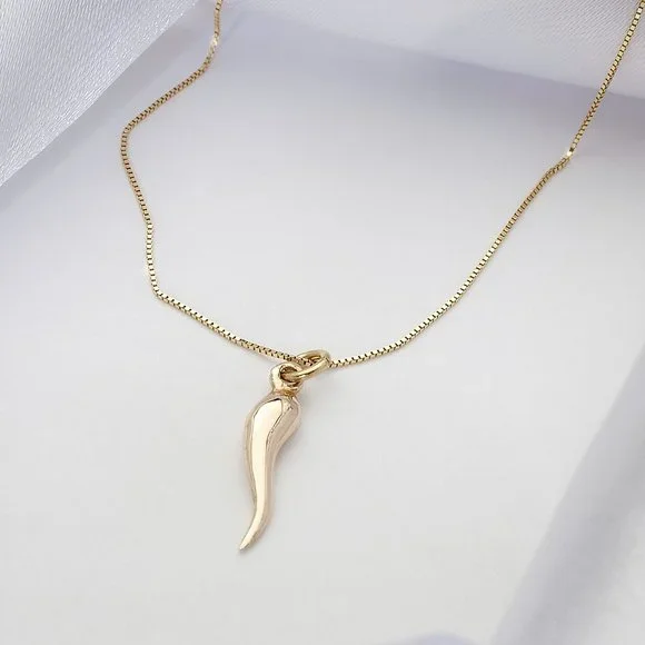 This Tiny Petite Cornicello Charm Necklace is lovely and dainty making it the perfect symbol for Good Luck & Protection Charm!This well known symbol of luck, crafted from 10k yellow gold!In Italian, they are called cornicello ( little horn), or corno portafortuna ( lucky horn), and worn as protective talisman/amulets!Made from Real 10K Gold - NOT Plated Gold - NOT Gold Filled!The chain is stamped 10K Italy.*Please note that the pendant charm is very tiny.Size of charm (including loop): 17.5 mm x 4.5 mm x 3 mmThe padlock pendant is finished with a 10K Solid Gold fine Box chain secured with a spring clasp closure.* Clasps are included in the total length of chain.Chain length: 16 inches or 18 inchesChain width: 0.5 mm