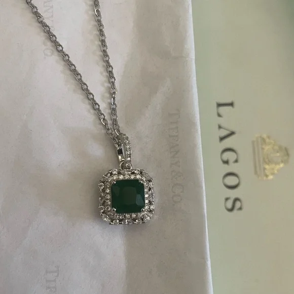 New! Never worn in my Jewelry Box.ASSCHER Emerald Green Cushion Pendant Necklace.Deep Rich Emerald Green.14k white gold finish, High Quality.Size: 18” in Richemont Designs...