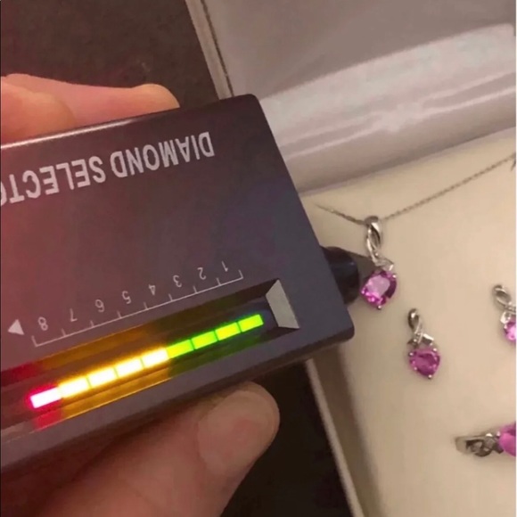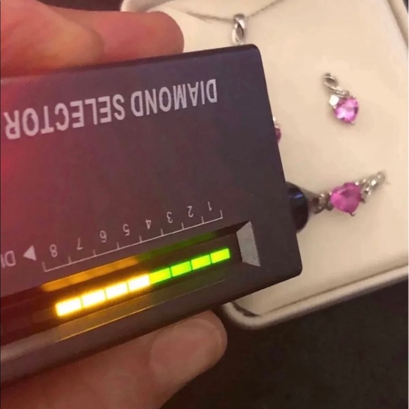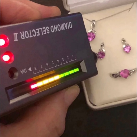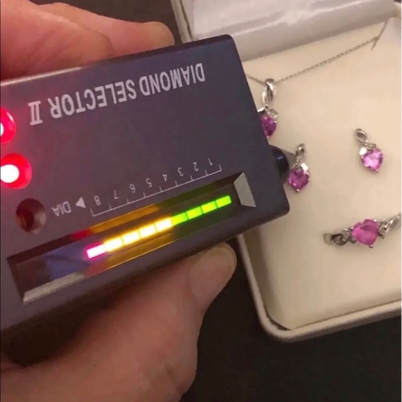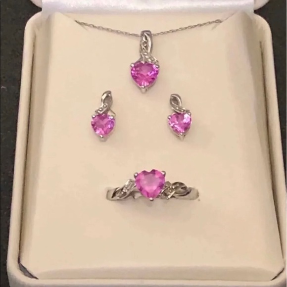 New came in jewelry box, only the original box it’s Damaged 10K Solid White Gold , encrusted Authentic Pink Ruby and Authentic Diamonds Set .Came all in the pics.10k real white Gold Authentic Diamonds and Rubies .Ring size 7.Pendant .Earrings .Delicate Chain measures 18”inch .Stamped RCJ Real White Gold“ NOT PLATED FILLED OR OVERLY “